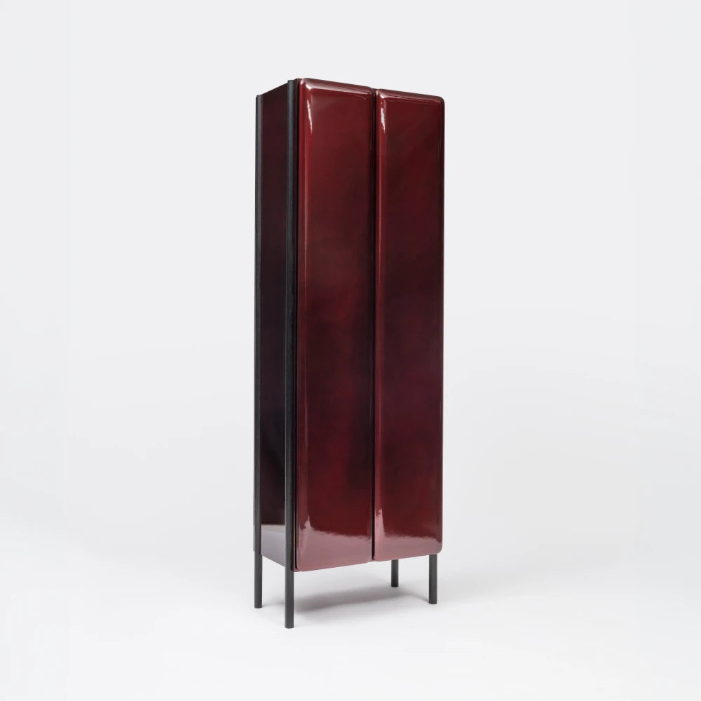 Simon CabrolThe Boo cabinet follows a vertical composition with elongated proportions. Its burgundy lacquer, worked with a nacre finish, catches the light and reveals deep tonal variations.