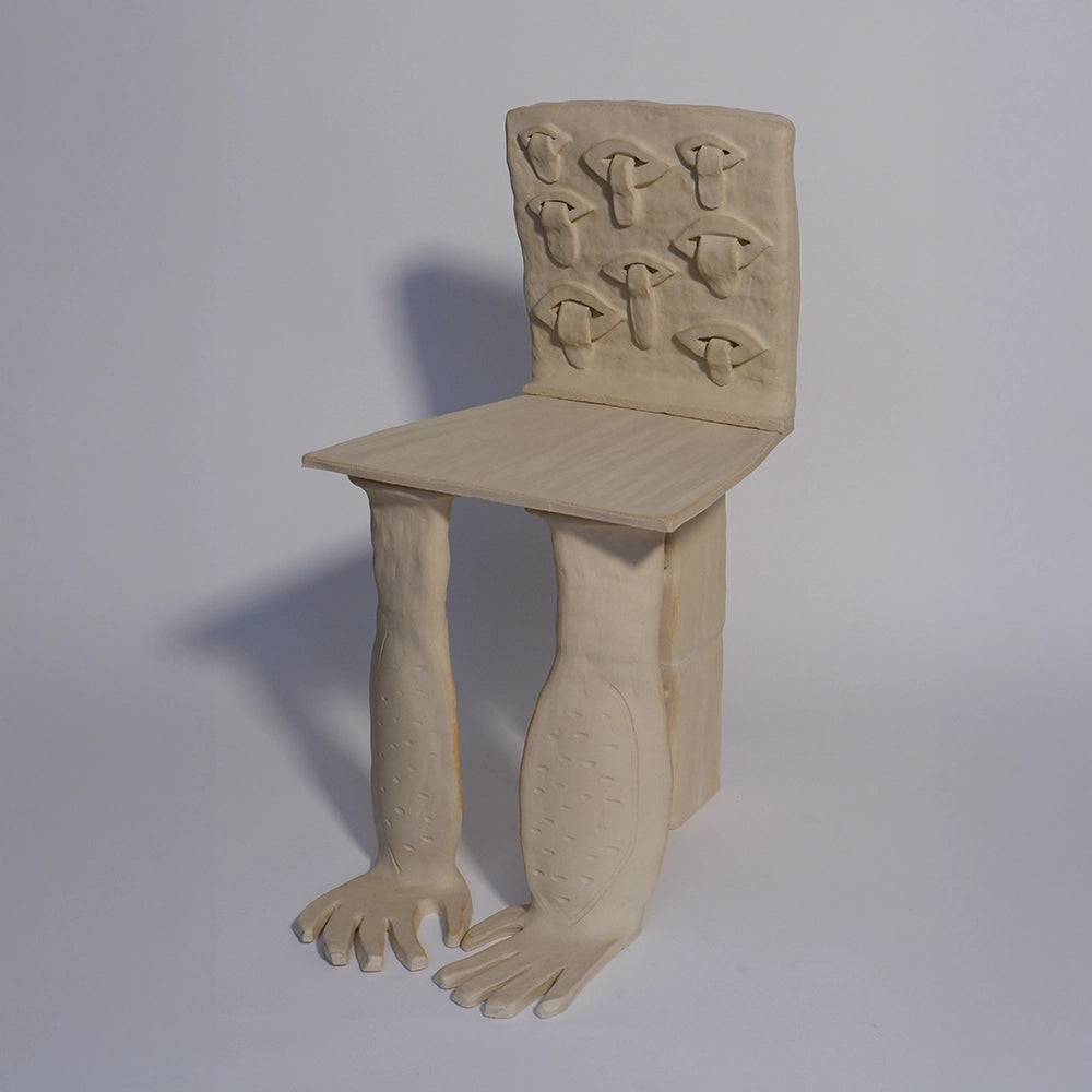 Ia KutateladzeThis ceramic chair pairs a rectangular seat with a backrest articulated by repeated relief motifs. The legs become figurative supporting volumes, clearly shaping the structure and...