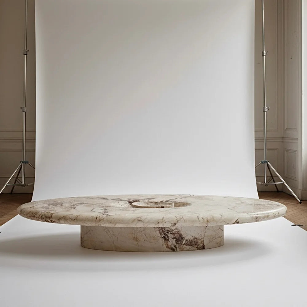 A monolithic occasional table carved in white onyx marble, shaped as a low, continuous circle. Softly honed, the surface reveals natural veining and a dense mineral...