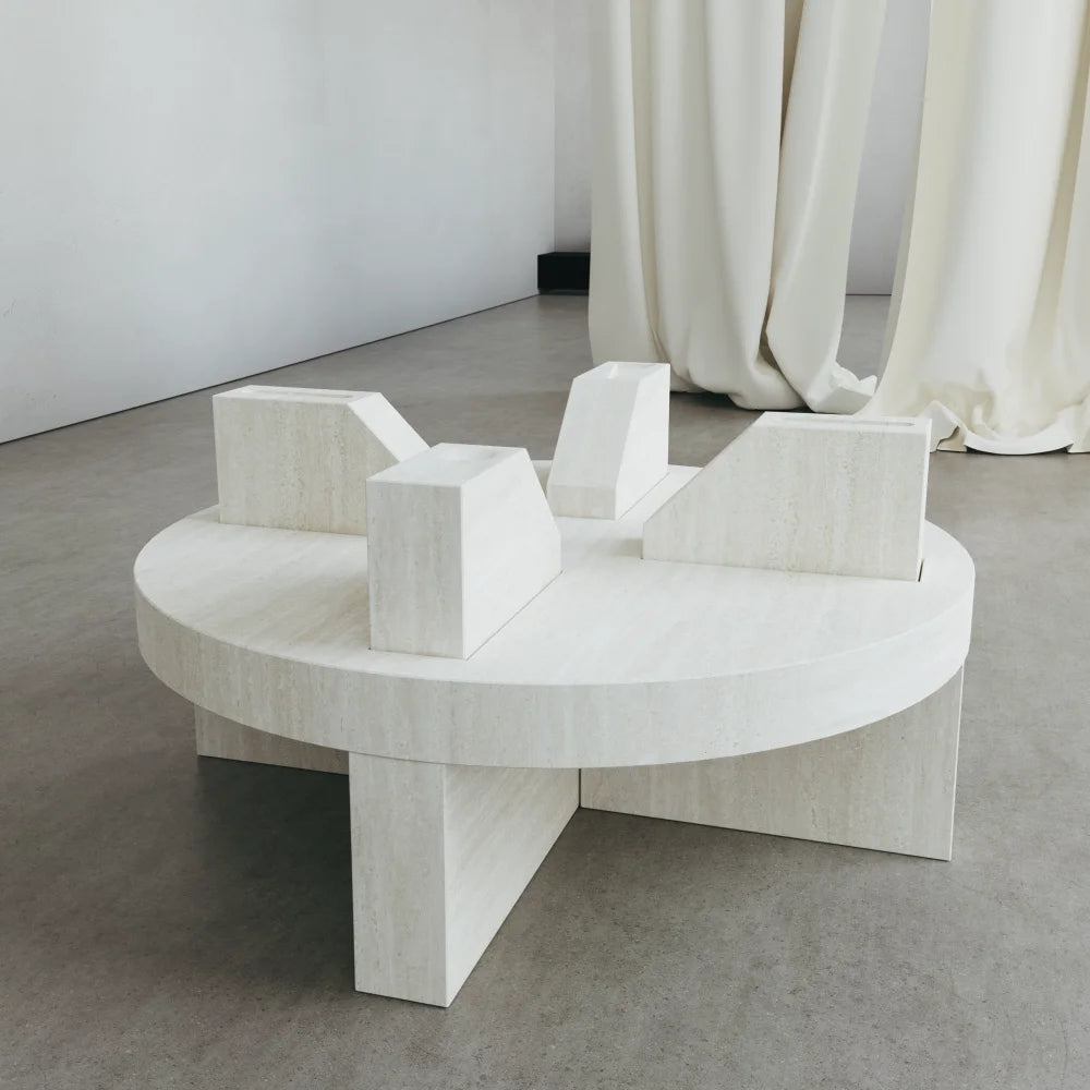 A sculptural coffee table composed of interlocking volumes and finished in a matte earthen surface. Its low, grounded composition recalls an architectural fragment resting in space,...