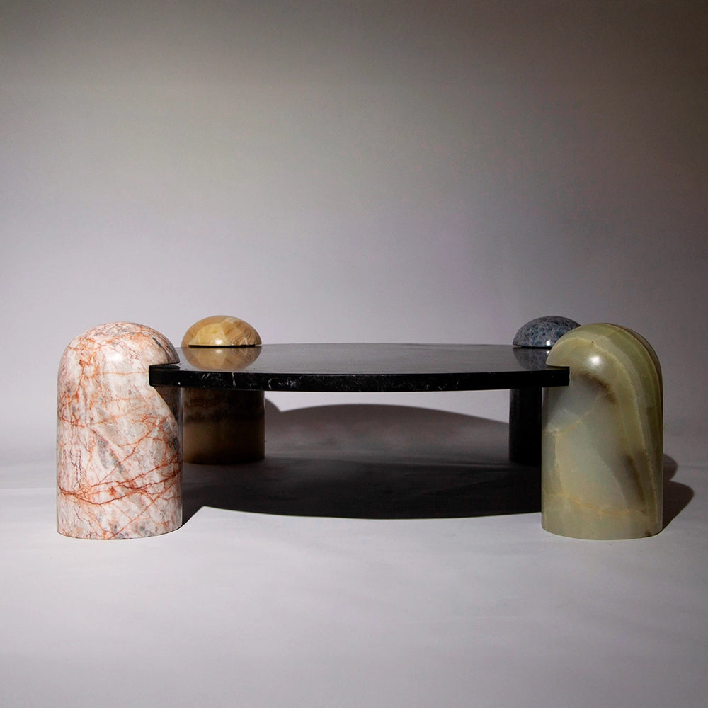 This stone coffee table stands on rounded pillars carved from contrasting marbles and onyxes. The circular top engages these colored volumes, forming a playful composition where...