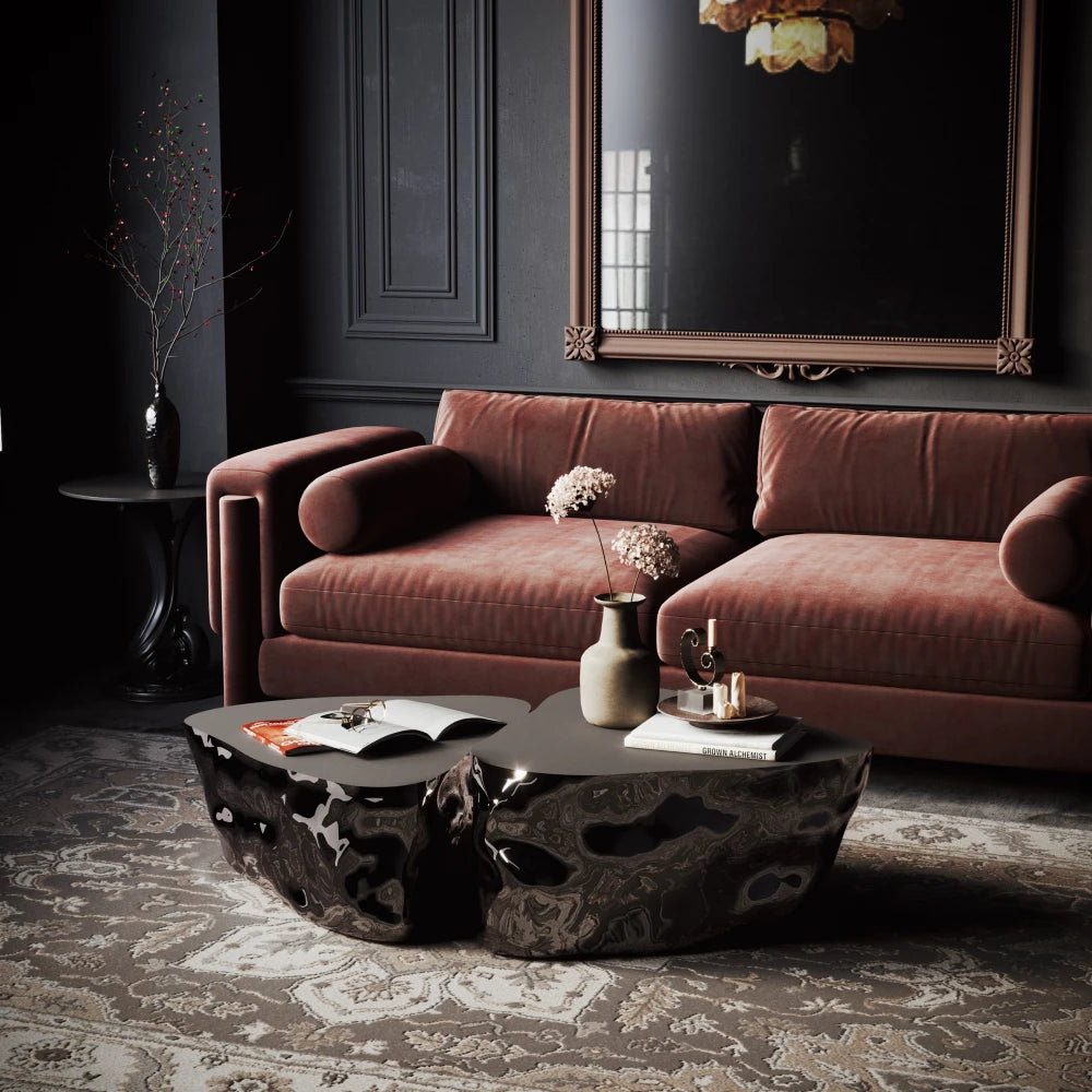 Nitush ArooshSculptural coffee table pairing an organic-edged top with a subtly textured cylindrical base in polished stainless steel. The contrast of volumes asserts a grounded presence, while...