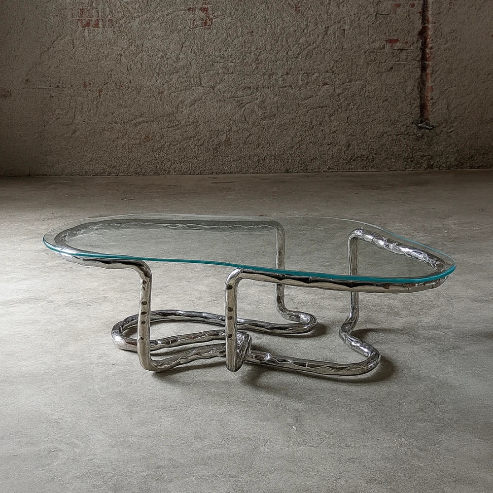 Nitush ArooshFree-flowing coffee table featuring a polished stainless steel base tracing a sinuous path across the floor. The structure appears to flow beneath the top, capturing shifting...