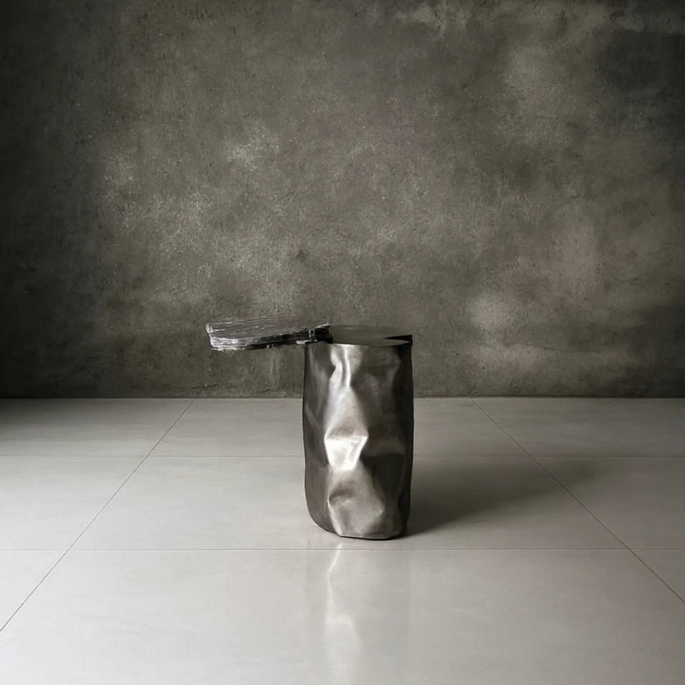 Nitush ArooshMonolithic console in polished stainless steel, with deliberately crumpled sides that capture and distort their surroundings. The mirrored surface generates a shifting, almost liquid depth. An...