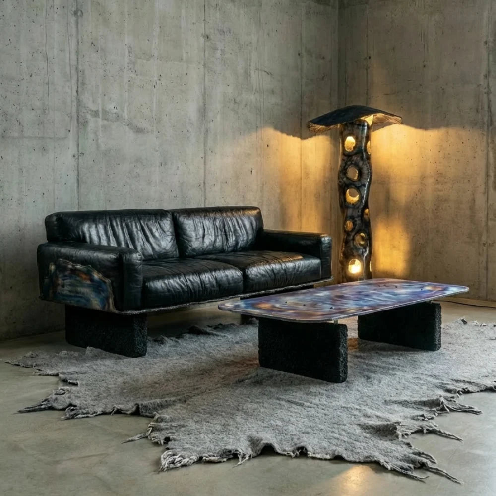 La colección USTIO se desarrolla a través de un conjunto limitado de piezas, cada una explorando el fuego como un proceso estructural y temporal. Los asientos, la iluminación y las mesas comparten la misma lógica material: el calor moldea el metal, la separación activa el espacio y la tensión sustituye a la masa. En lugar de repetir una forma, cada objeto aplica los mismos principios a una escala diferente, permitiendo que la función y la escultura coexistan. Juntas, las piezas forman un sistema coherente donde el fuego, la memoria material y la duración definen tanto la presencia como el uso.