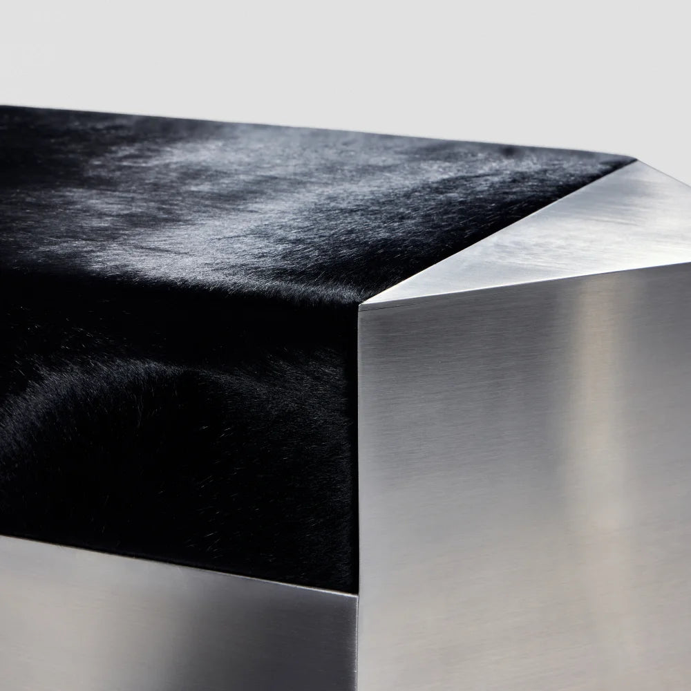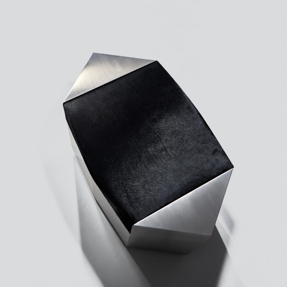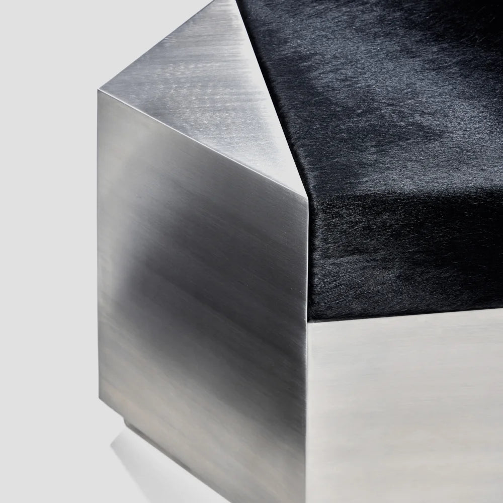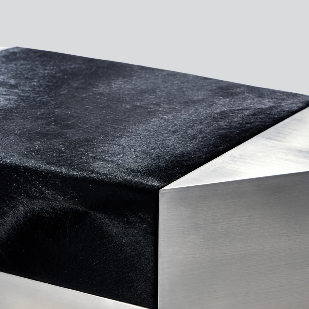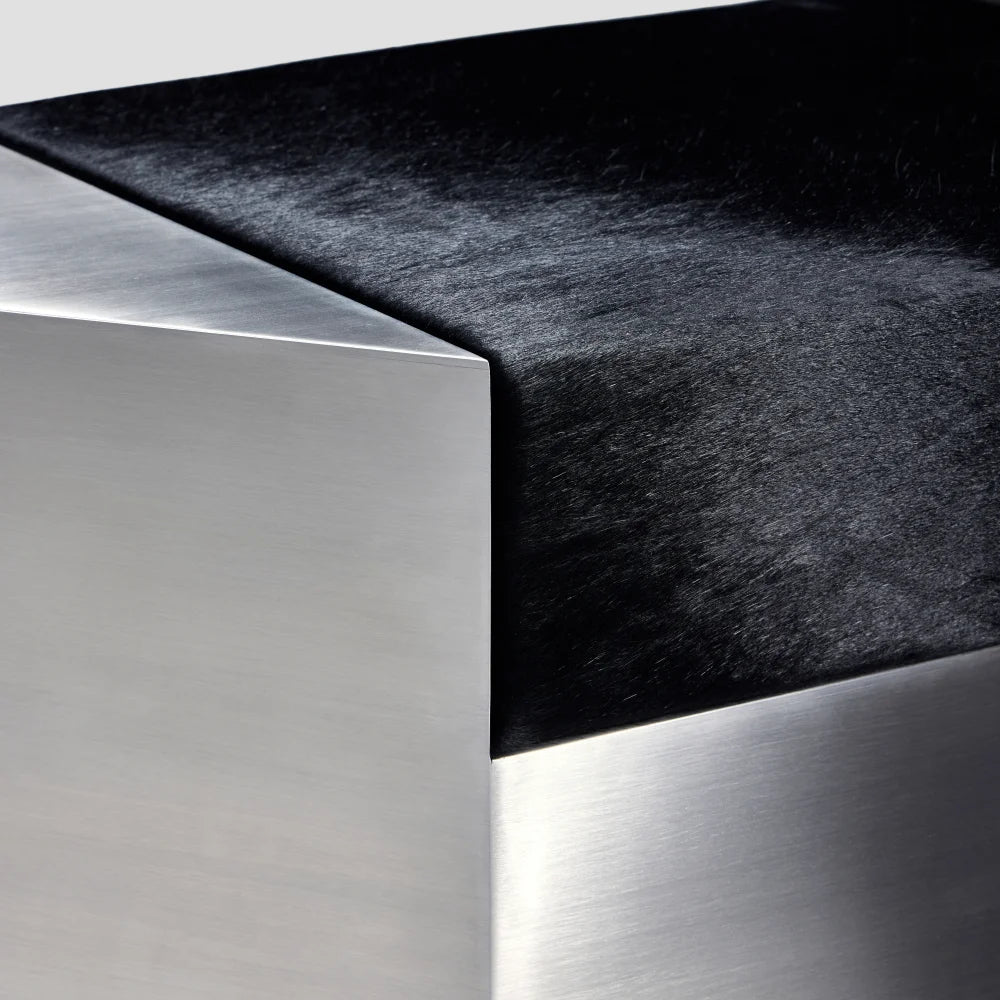 Este puf escultural combina una estructura de acero cepillado con un cojín de piel de vacuno de color negro intenso. Concebido como un objeto modular, aporta presencia arquitectónica y una comodidad discreta, equilibrando el uso ocasional del asiento con el carácter de una pieza de diseño.