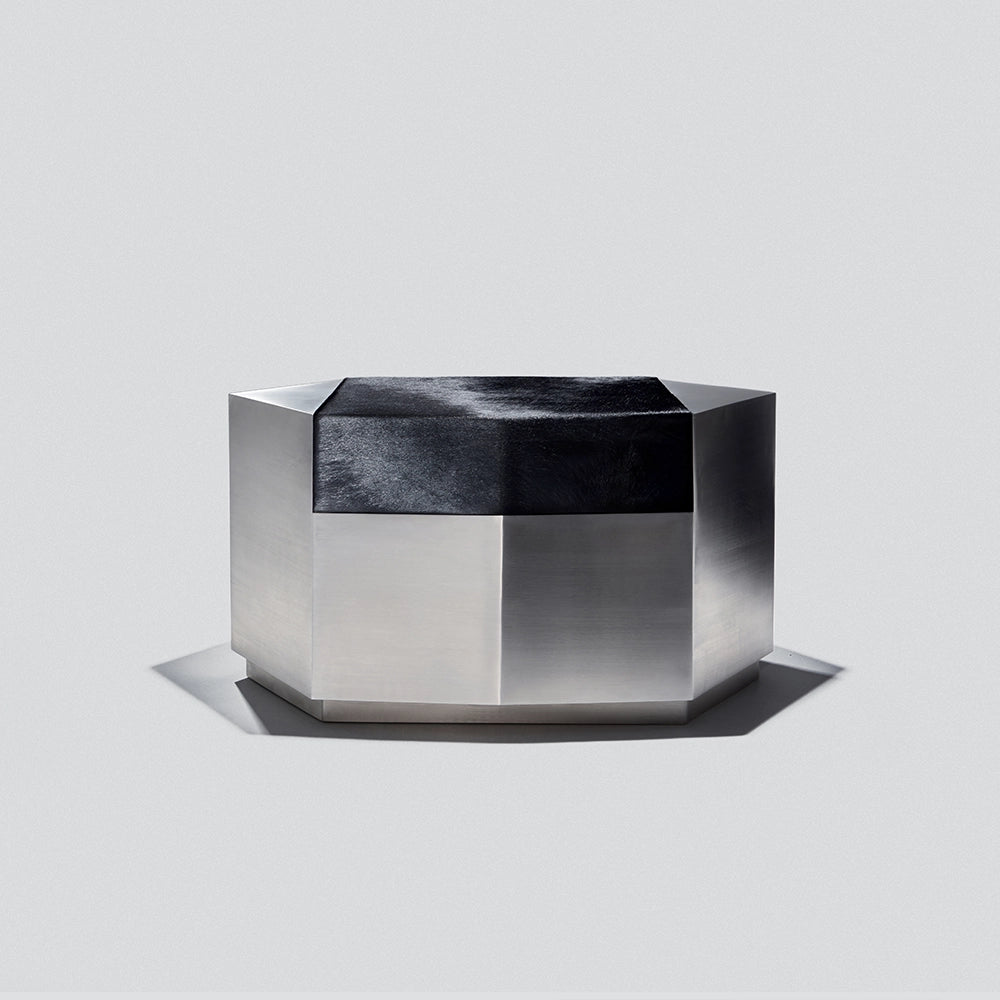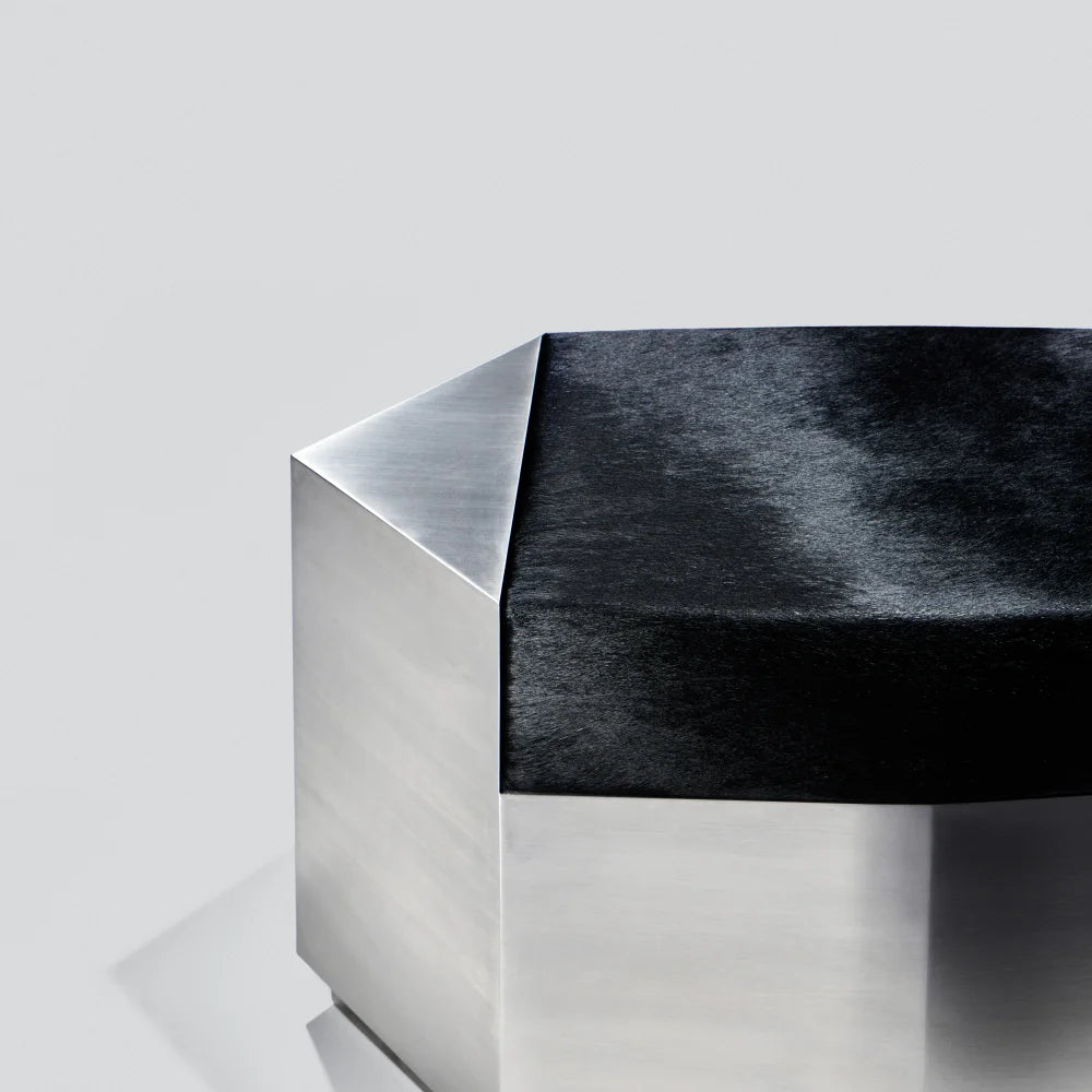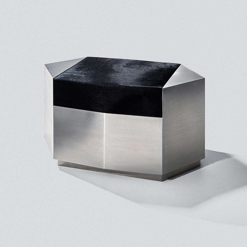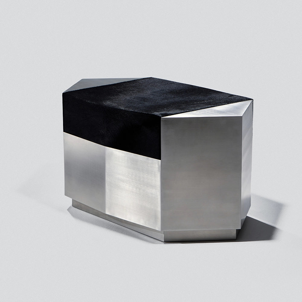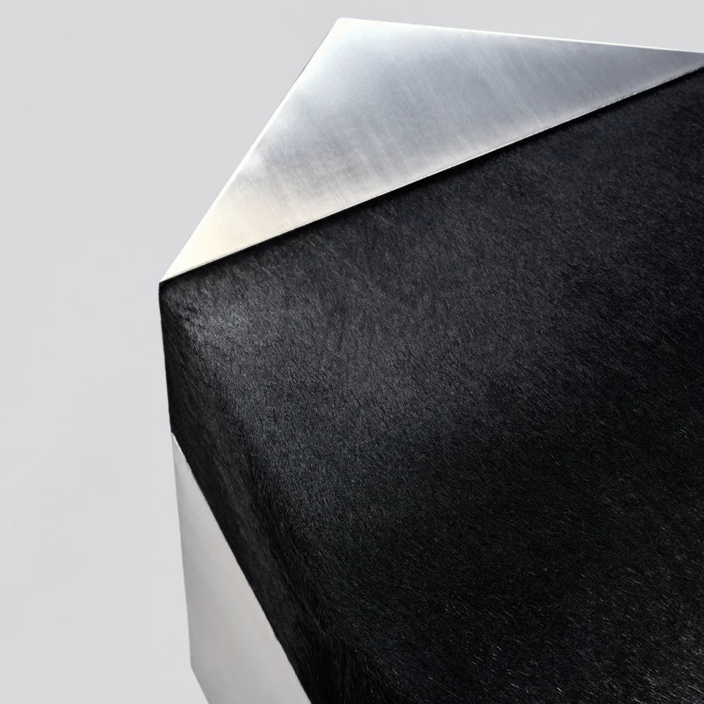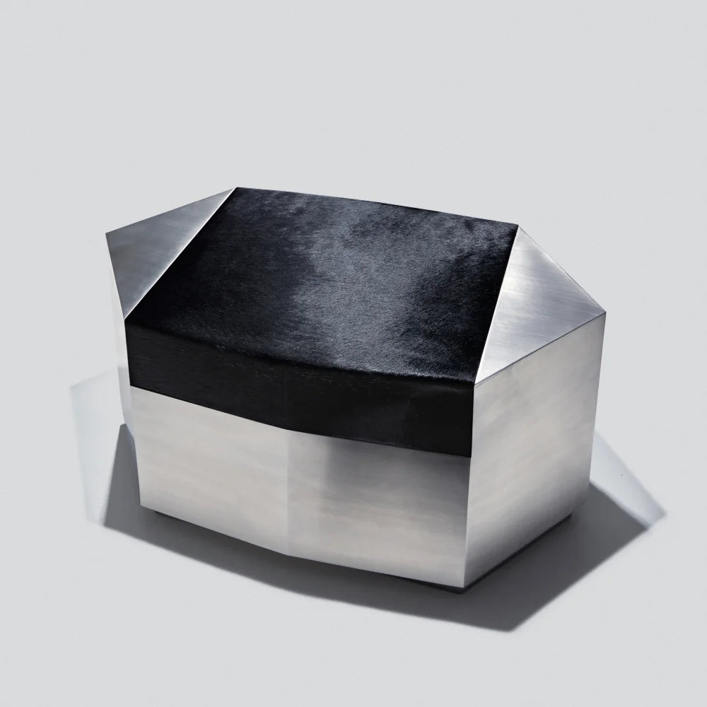Este puf escultural combina una estructura de acero cepillado con un cojín de piel de vacuno de color negro intenso. Concebido como un objeto modular, aporta presencia arquitectónica y una comodidad discreta, equilibrando el uso ocasional del asiento con el carácter de una pieza de diseño.