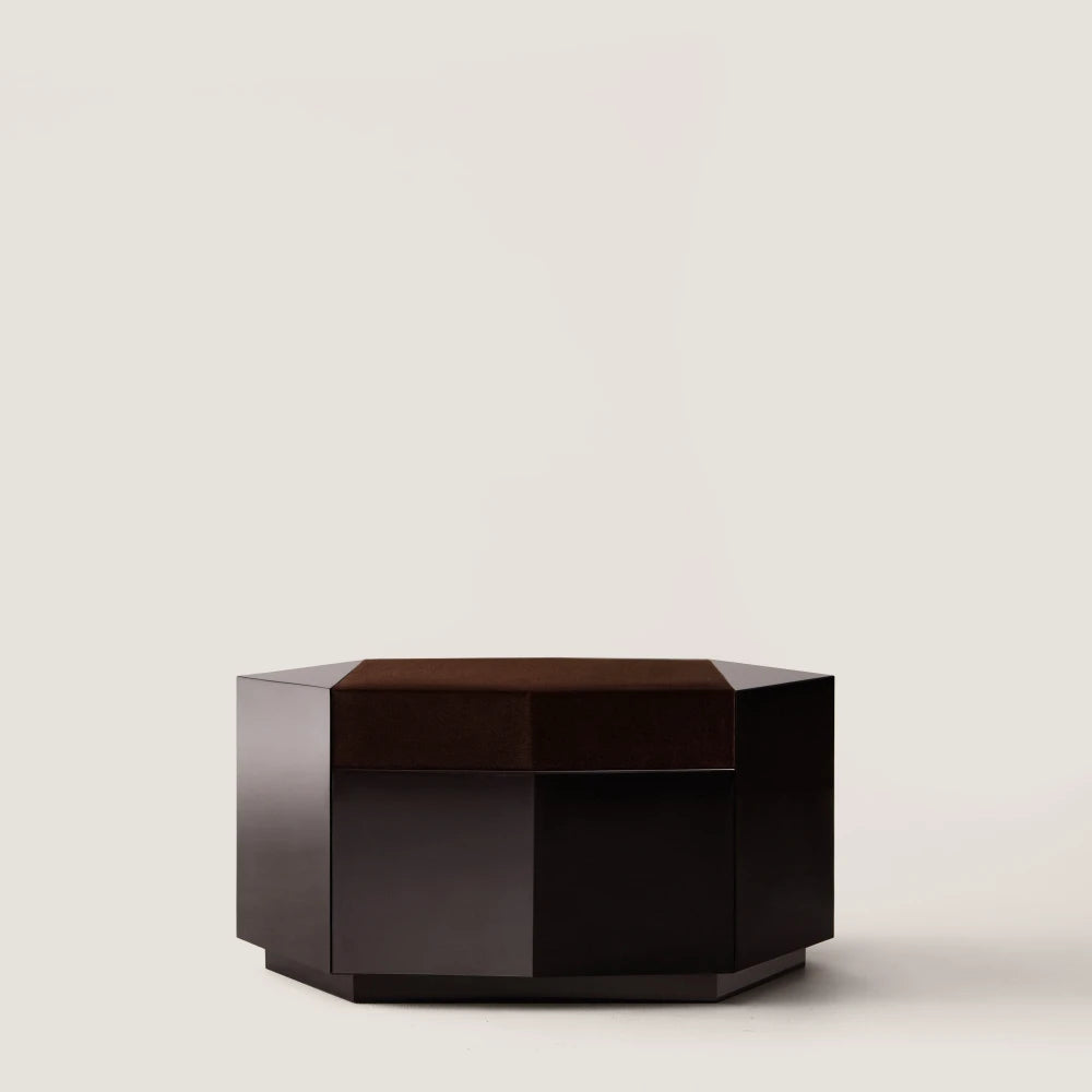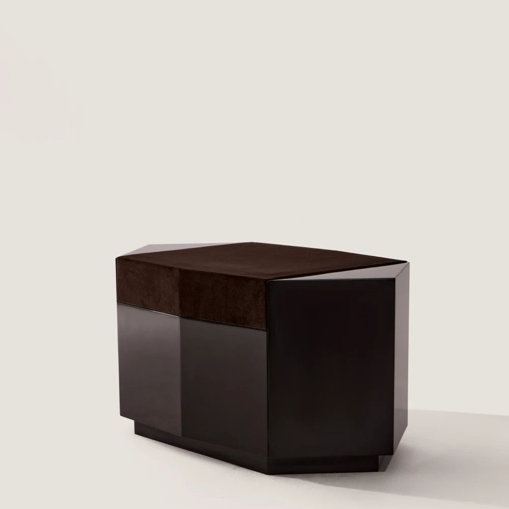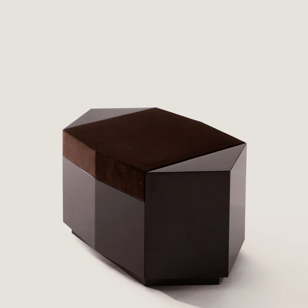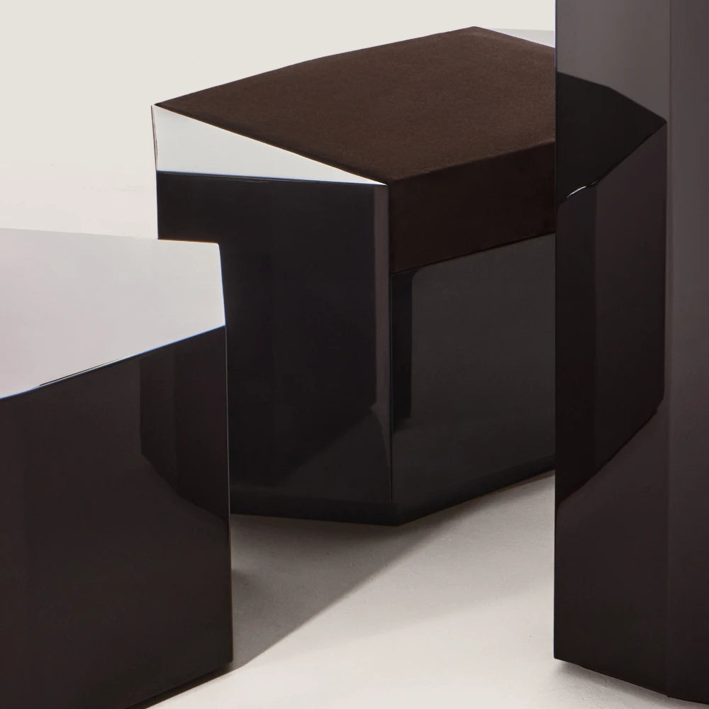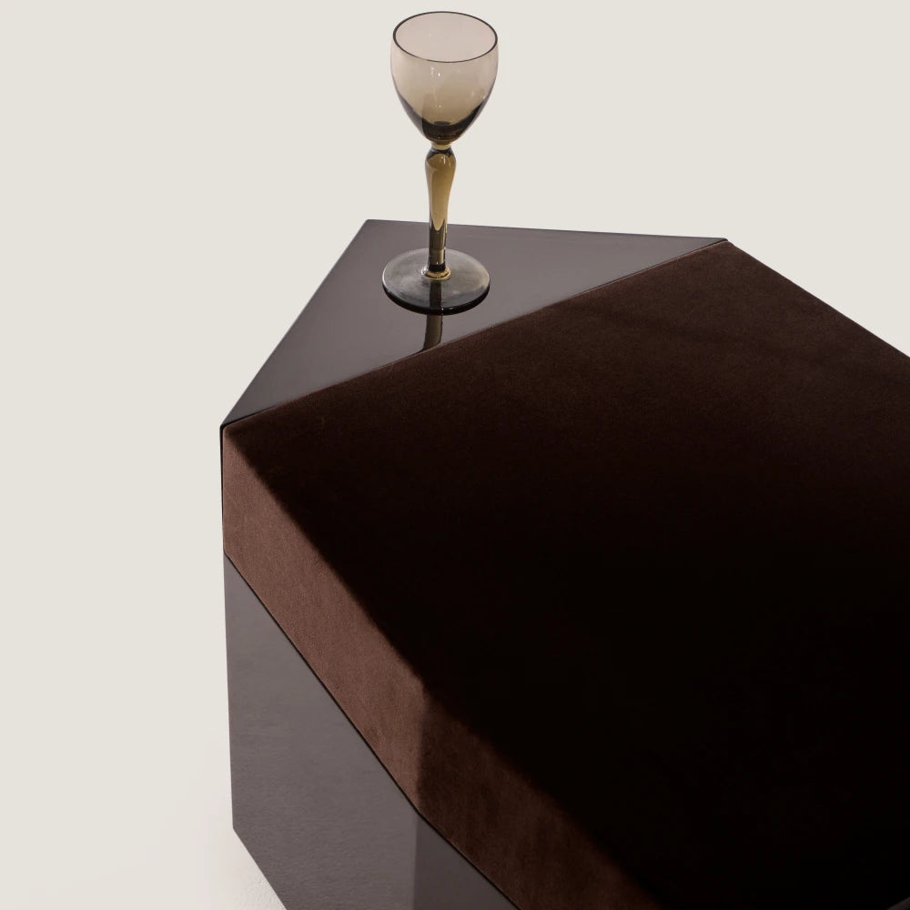 Este puf escultural conserva la misma geometría y presencia arquitectónica. En laca brillante, la forma se ve más completa y unificada, mientras que el asiento de terciopelo introduce un contraste más suave y táctil en la composición general.