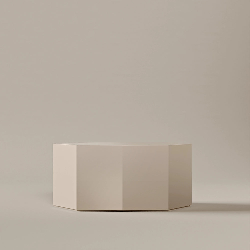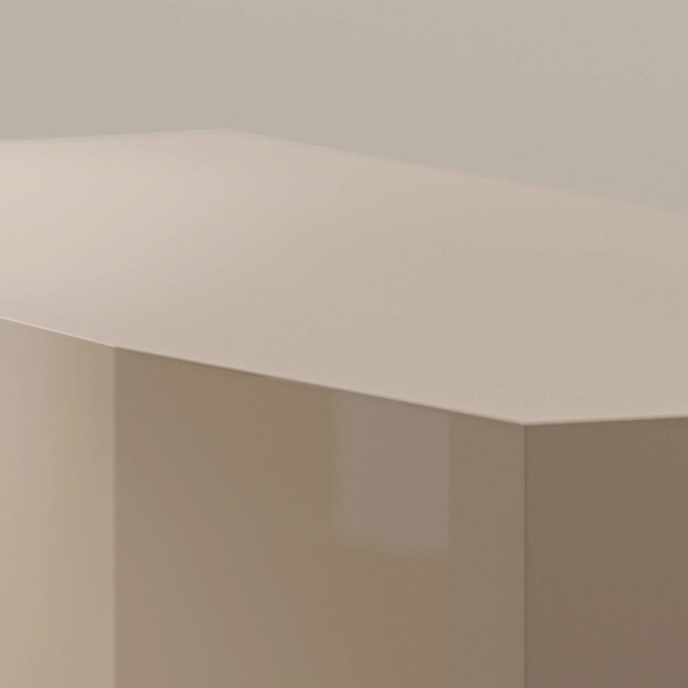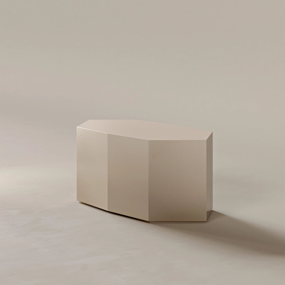Ame III conserva su geometría facetada y su porte bajo y sobrio. El lacado brillante color ostra realza la continuidad y la reflexión de la luz, presentando la mesa como un volumen claro y autónomo con una mayor luminosidad.