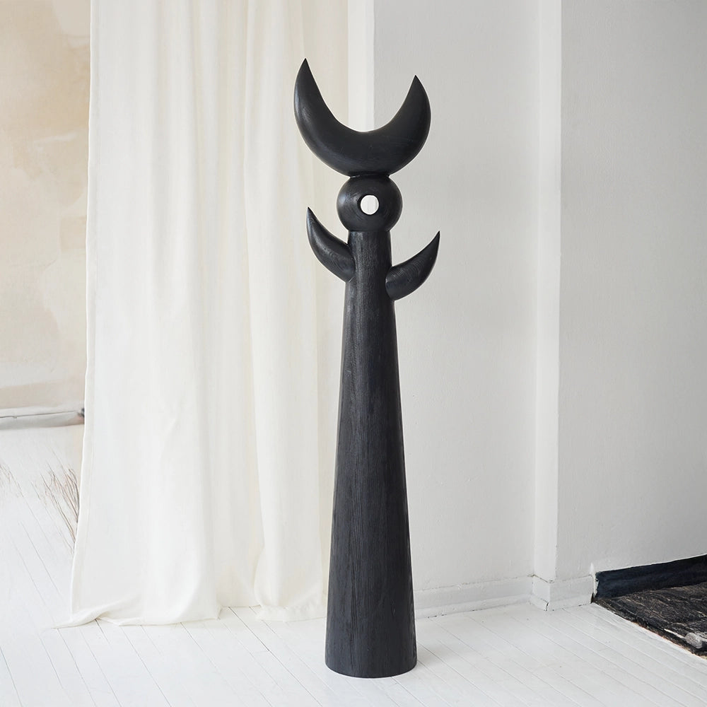 Pich es una escultura de madera quemada que se define por una fuerte presencia vertical. Volúmenes articulados y formas abiertas conforman una figura casi totémica, donde la superficie de textura oscura expresa un lenguaje simbólico, equilibrando la fuerza primitiva con la precisión formal.