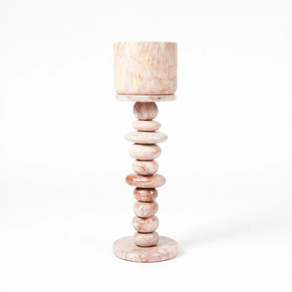 Fos Cooler tiene la forma de una columna de mármol rosa, acentuada por formas redondeadas apiladas y rematada con un recipiente tallado. Mitad escultura, mitad objeto funcional, aporta una presencia refinada al espacio.