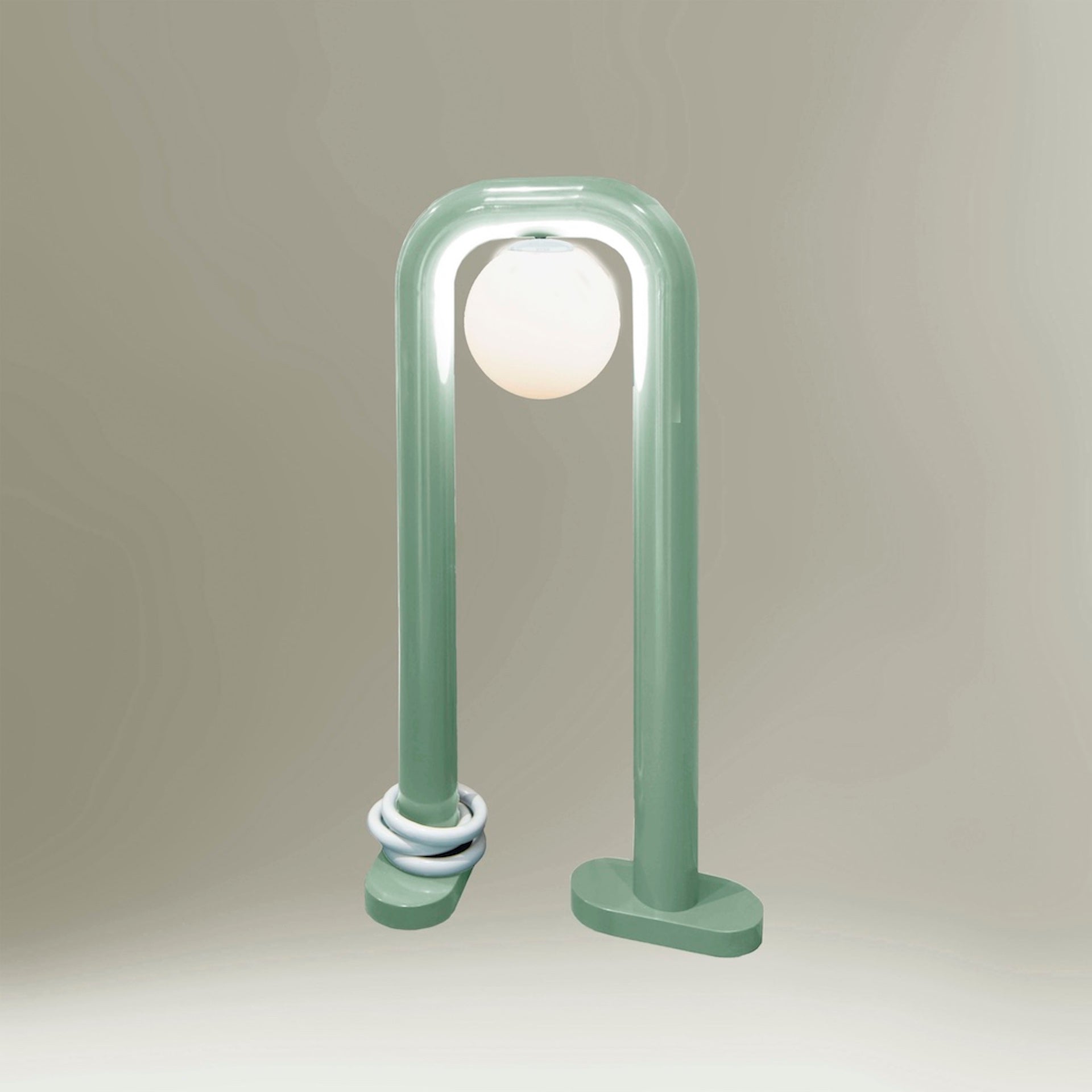 Esta lámpara de pie está formada por una estructura tubular curvada que crea un arco continuo. Una luz esférica suspendida se encuentra en el centro, mientras que un elemento de color en espiral envuelve la base, añadiendo un llamativo toque gráfico.