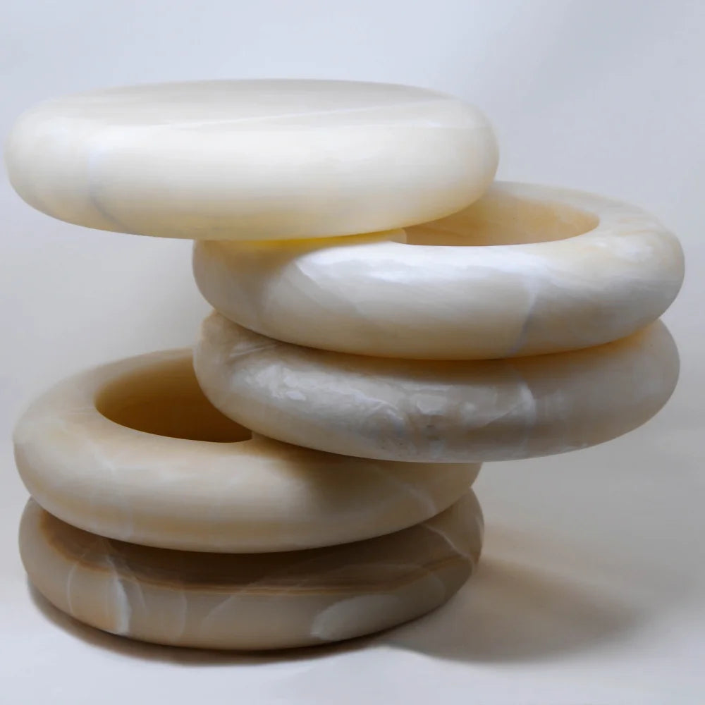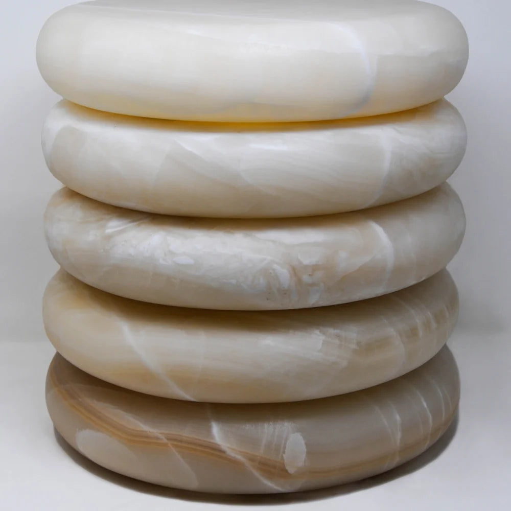 Esta mesa auxiliar de mármol se compone de volúmenes apilados, suavemente redondeados, cada uno cuidadosamente pulido. La forma en capas crea una silueta densa y serena, mientras que las vetas naturales garantizan la singularidad de cada pieza, equilibrando la función doméstica con la presencia escultural.
