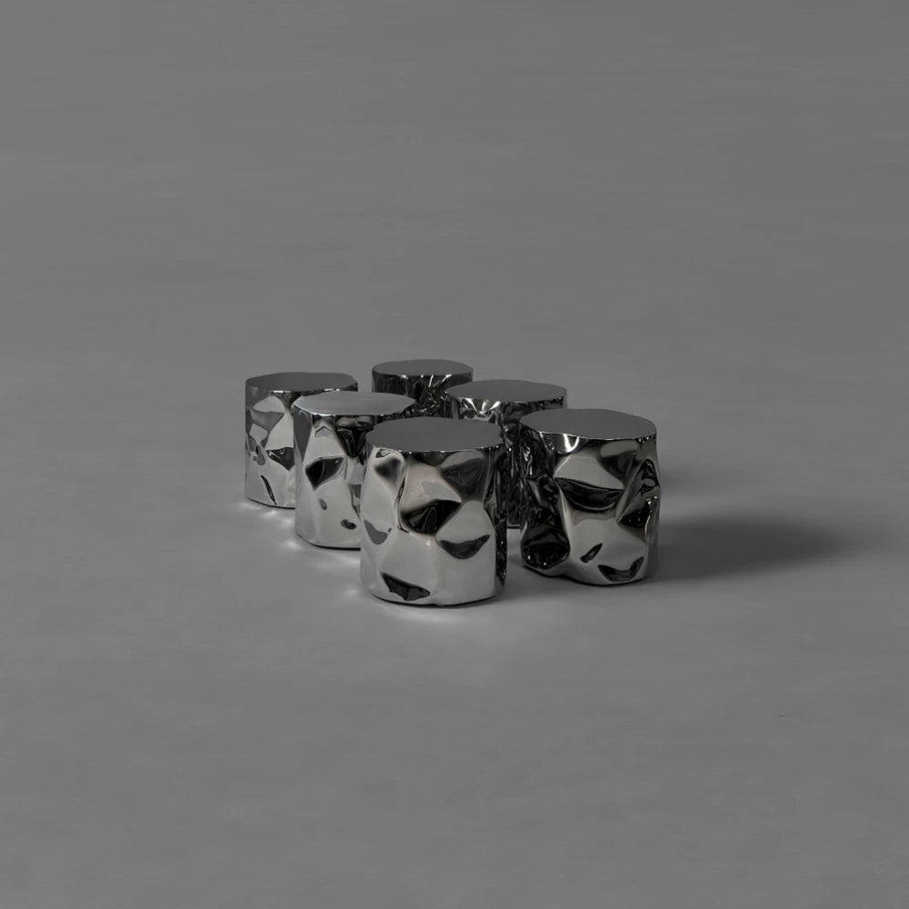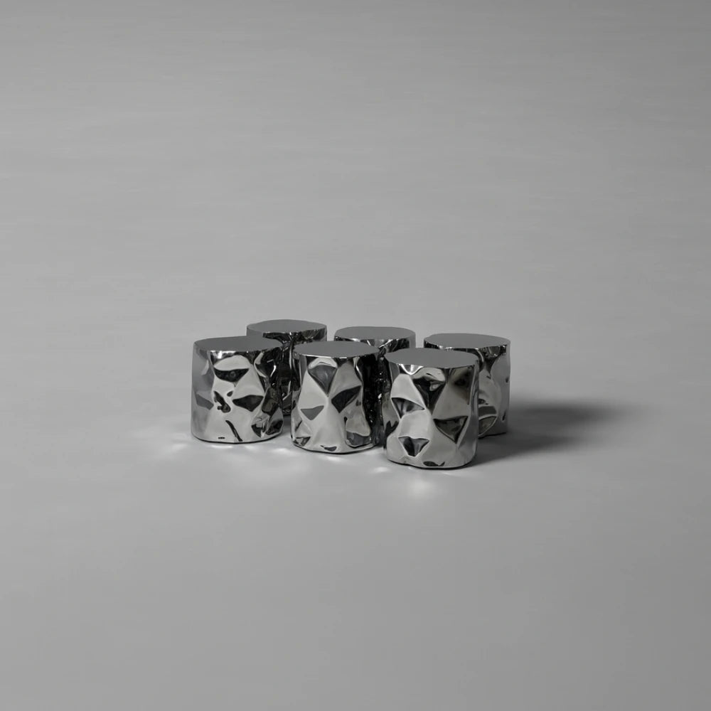 Mesa de centro modular compuesta por volúmenes cilíndricos de acero inoxidable pulido, cuyas superficies facetadas parecen prensadas desde dentro. Reflejos fragmentados animan la composición y multiplican las perspectivas, dotando a la pieza de energía gráfica y una presencia contemporánea y contundente.