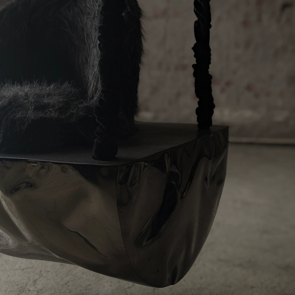 Asiento suspendido de acero inoxidable pulido, cuya base facetada parece moldeada por presión. Sujeto por cuerdas retorcidas, equilibra la tensión estructural con la suavidad de su cojín. Una pieza emblemática que oscila entre la fuerza bruta y la poesía contemporánea.