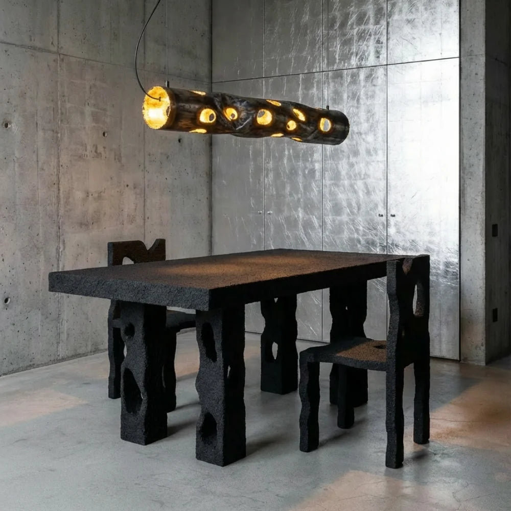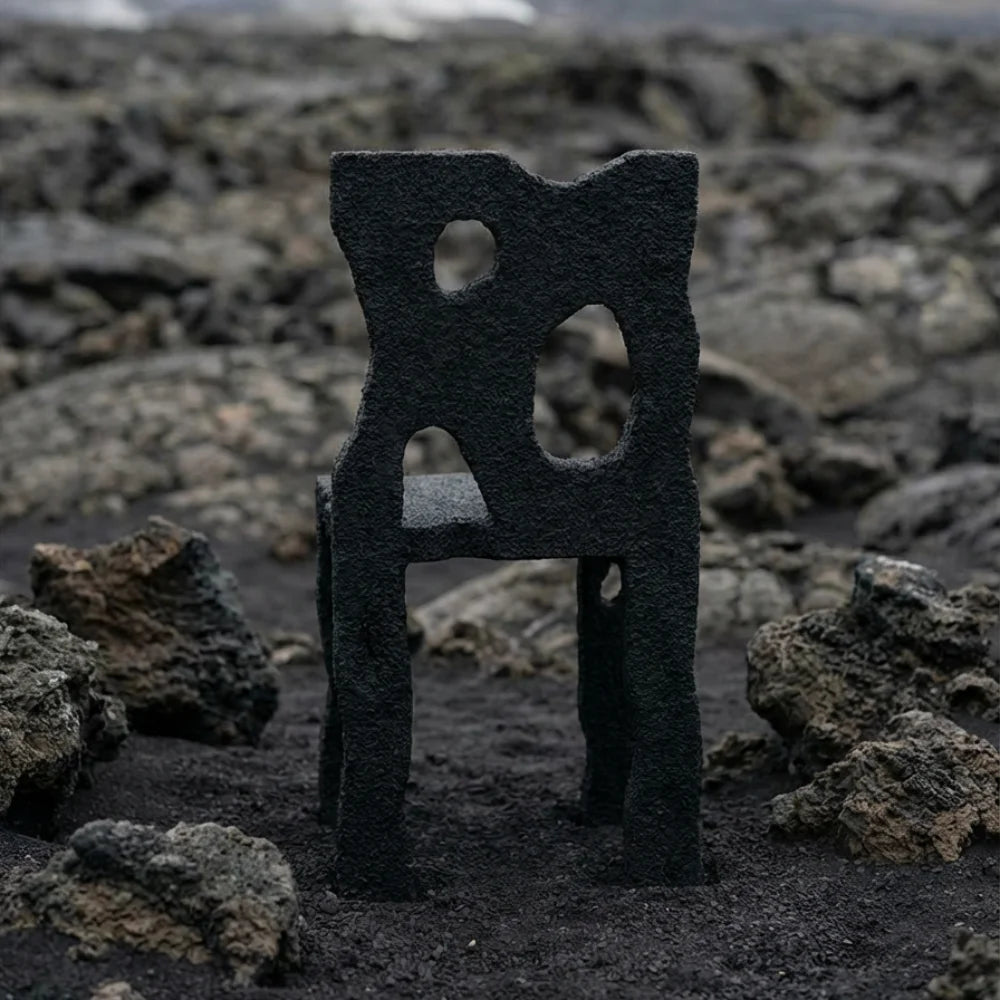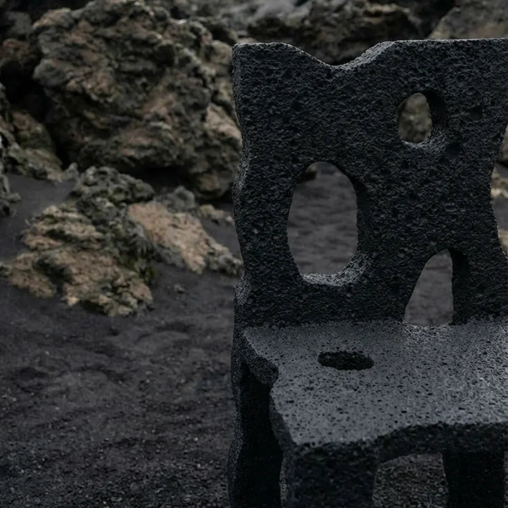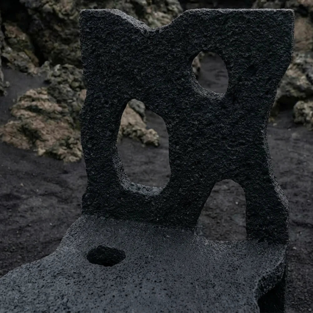 La chaise Aetna est une chaise sculpturale caractérisée par des surfaces brutes et texturées, inspirées des coulées de lave et des strates minérales. Sa silhouette monolithique et perforée équilibre masse et structure, affirmant une présence puissante entre densité du matériau et forme.