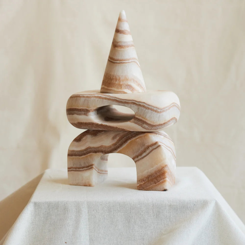 Cette sculpture en marbre taillée à la main explore la verticalité et l'équilibre par la superposition de formes. Les veinures naturelles et les variations de tons rendent chaque pièce unique, évoquant une présence rituelle entre objet fonctionnel et artefact sculptural.