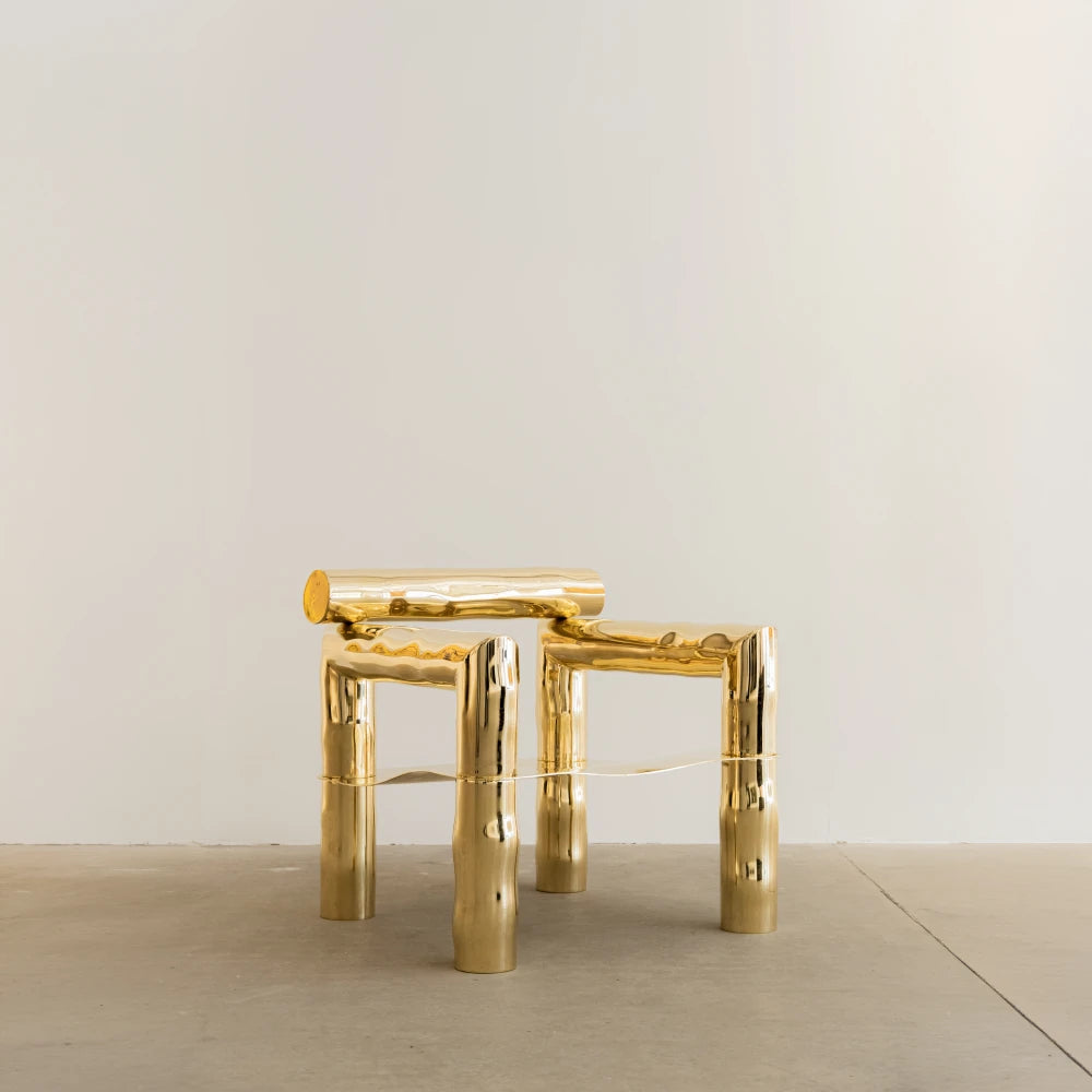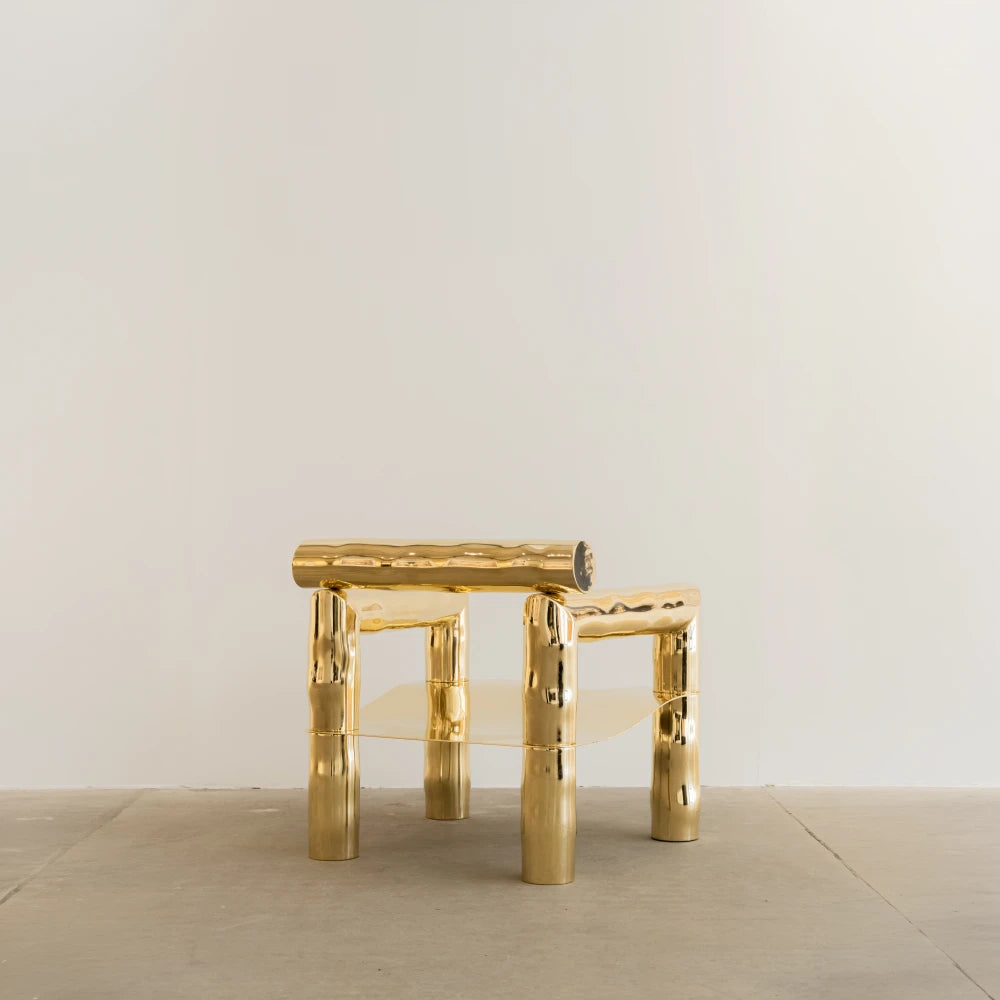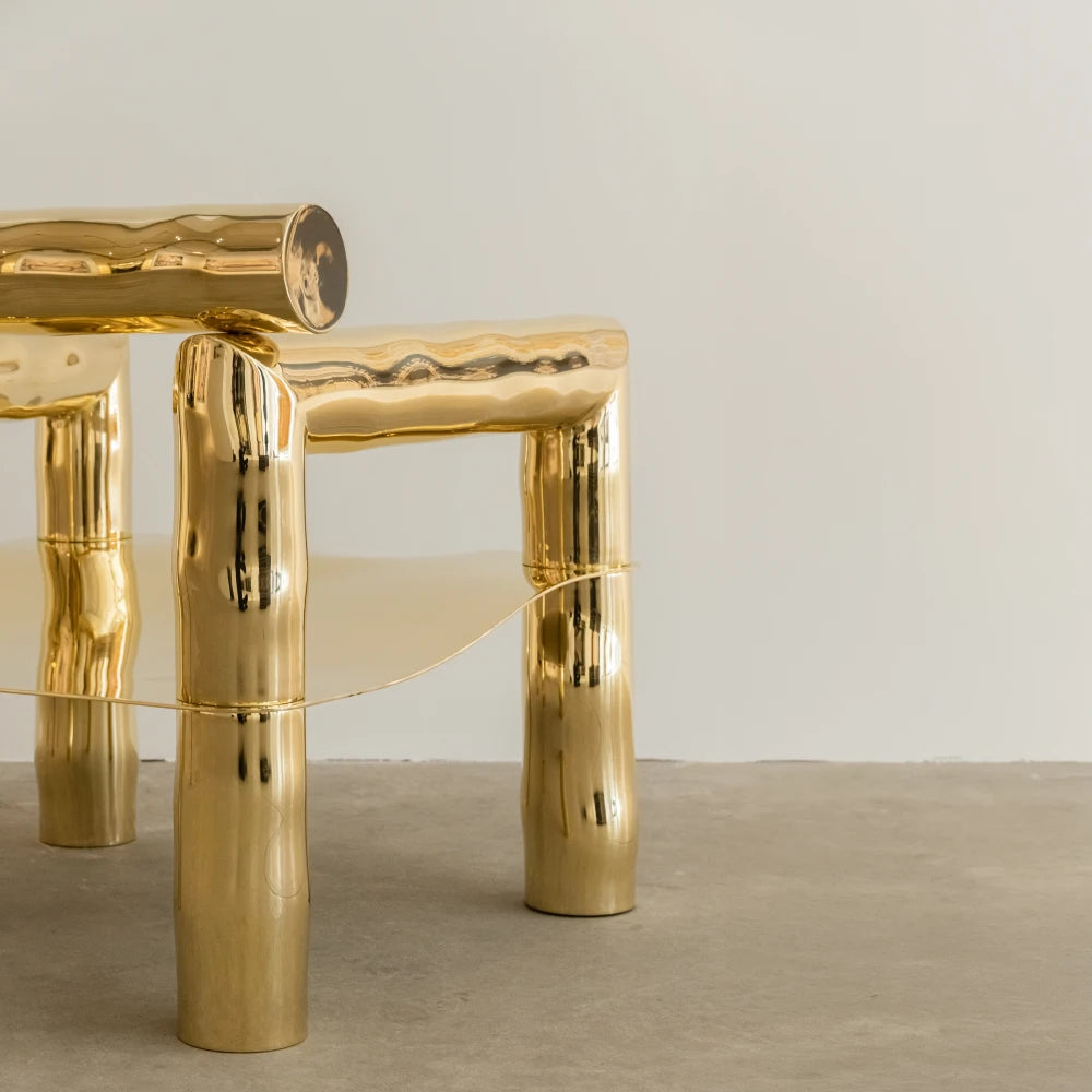 Issu de la collection Noème , BOBI réinterprète le fauteuil comme une structure tubulaire en laiton poli, brut et non verni. Des lignes arrondies, étirées et libérées, dessinent une assise sculpturale au rythme fluide. Produite en édition limitée, cette pièce allie la robustesse architecturale à une sensualité organique.