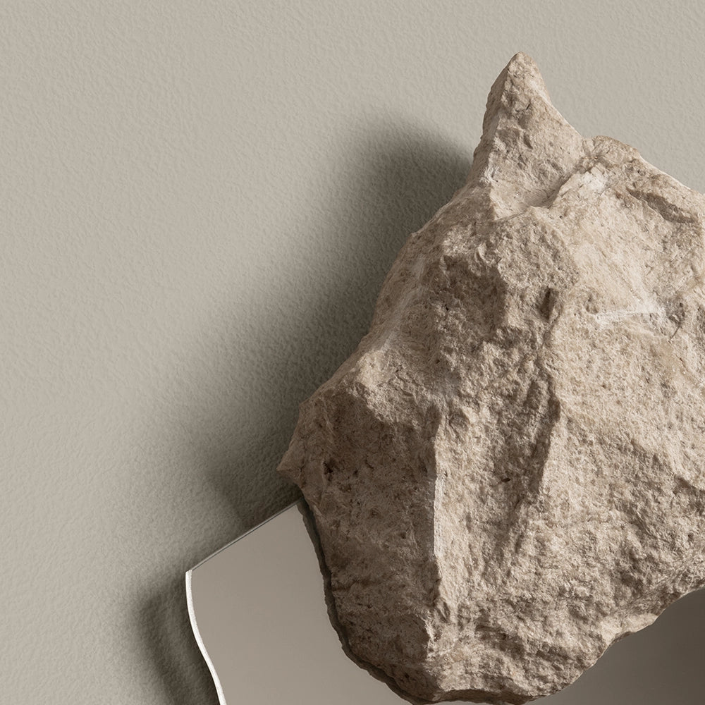 Un ensemble de miroirs muraux composé de fragments de verre irréguliers associés à des éléments de pierre brute. Les pièces forment une composition sculpturale libre, jouant sur l'équilibre entre reflet, vide et texture minérale sur le mur.