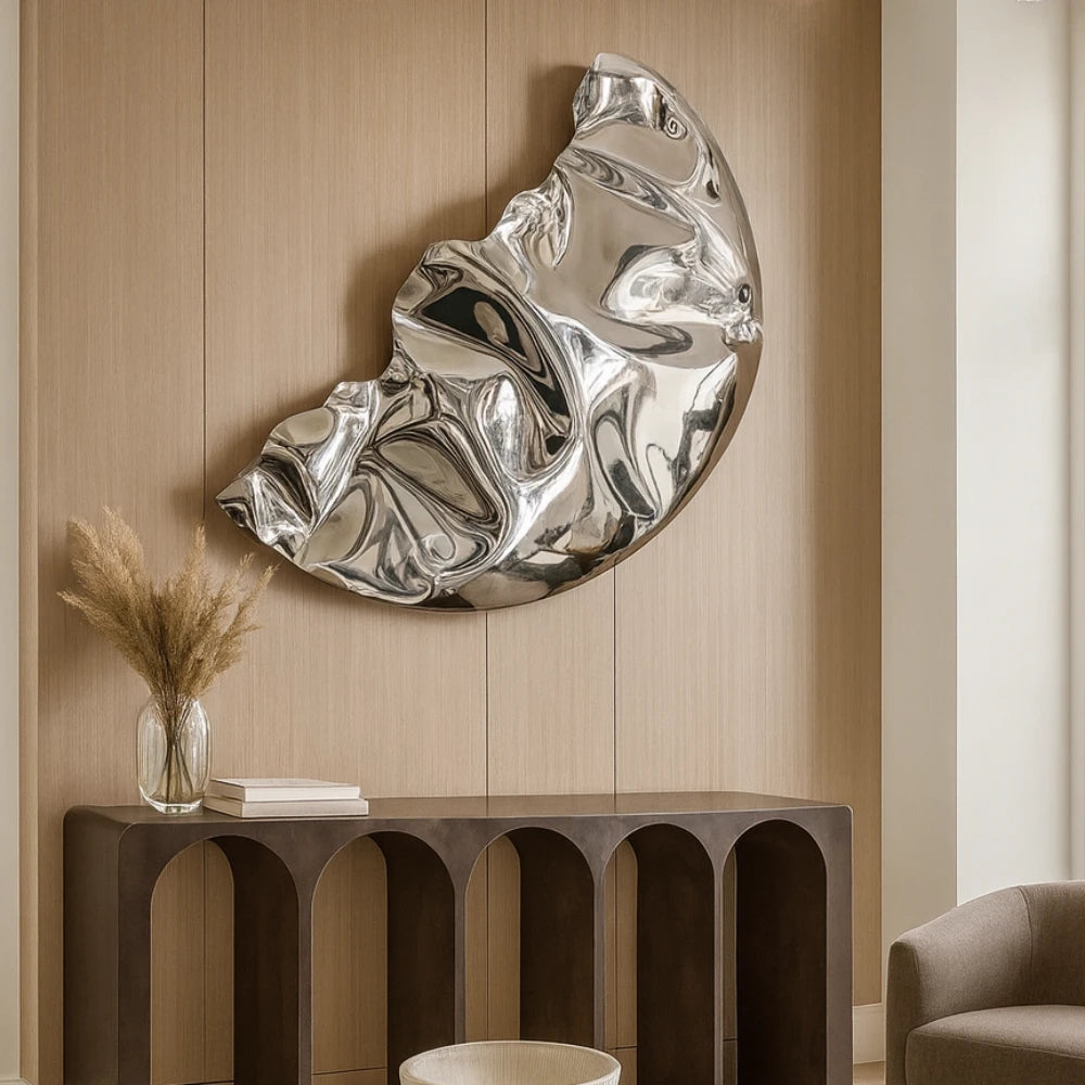 Applique murale en acier inoxydable poli, dont la silhouette aux formes libres évoque un croissant suspendu. La surface miroitante diffuse une douce lumière changeante, projetant des halos vibrants sur le mur. Une présence sculpturale à la fois poétique et résolument contemporaine.