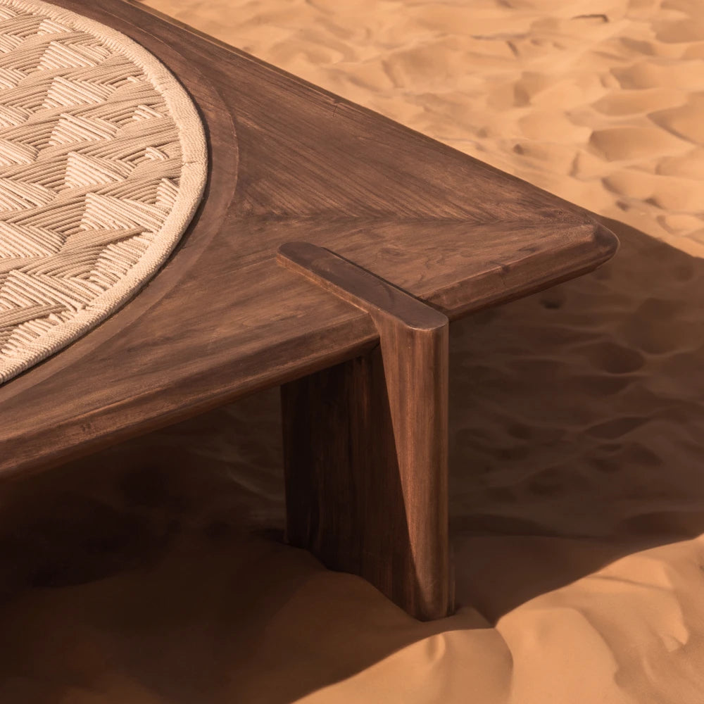Le lit de jour Daybed Family est un meuble large et bas, construit autour d'une structure en bois massif intégrant une assise circulaire tressée. La surface ronde est délimitée par un périmètre carré, tandis que des supports solides sous le cadre définissent la structure.