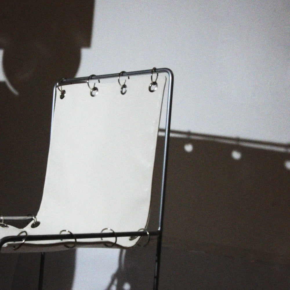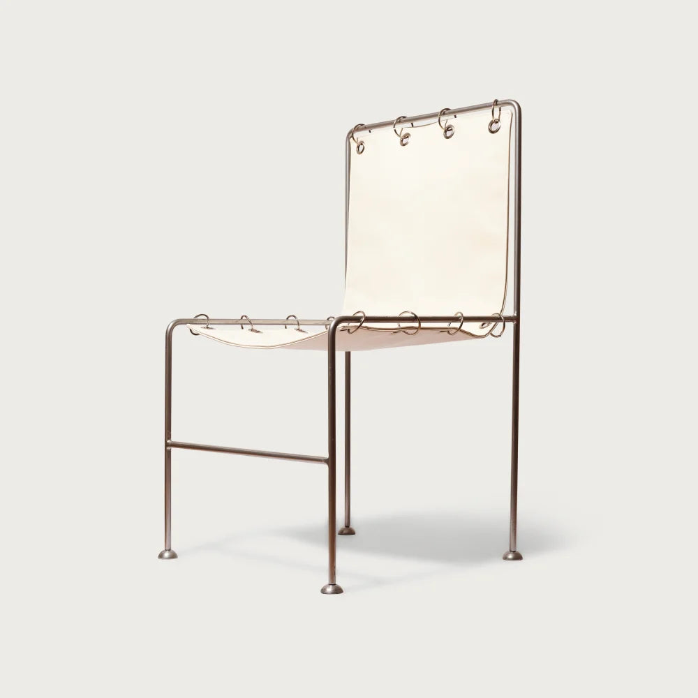 Cette chaise associe une structure métallique minimaliste à une assise et un dossier en cuir suspendus par des anneaux apparents. Les fixations apparentes créent une tension maîtrisée entre rigueur institutionnelle, confort sobre et une lecture subtilement clinique de l'objet domestique.