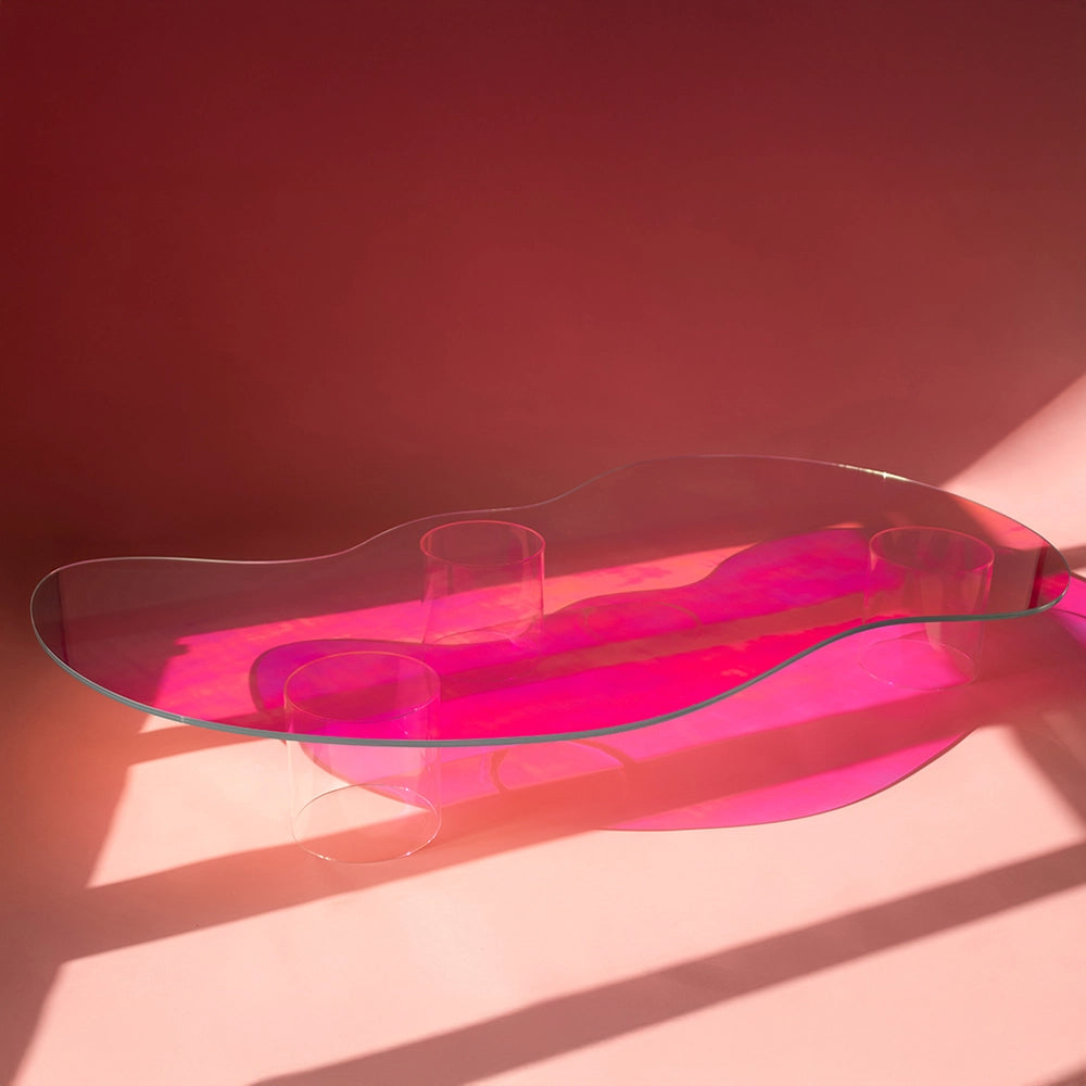 Cette table basse associe un plateau en verre aux formes libres à un piètement en plexiglas teinté. Des volumes transparents superposés filtrent la lumière et les couleurs, créant des nuances changeantes selon l'angle de vue et l'éclairage, définies par la superposition et la clarté des matériaux.