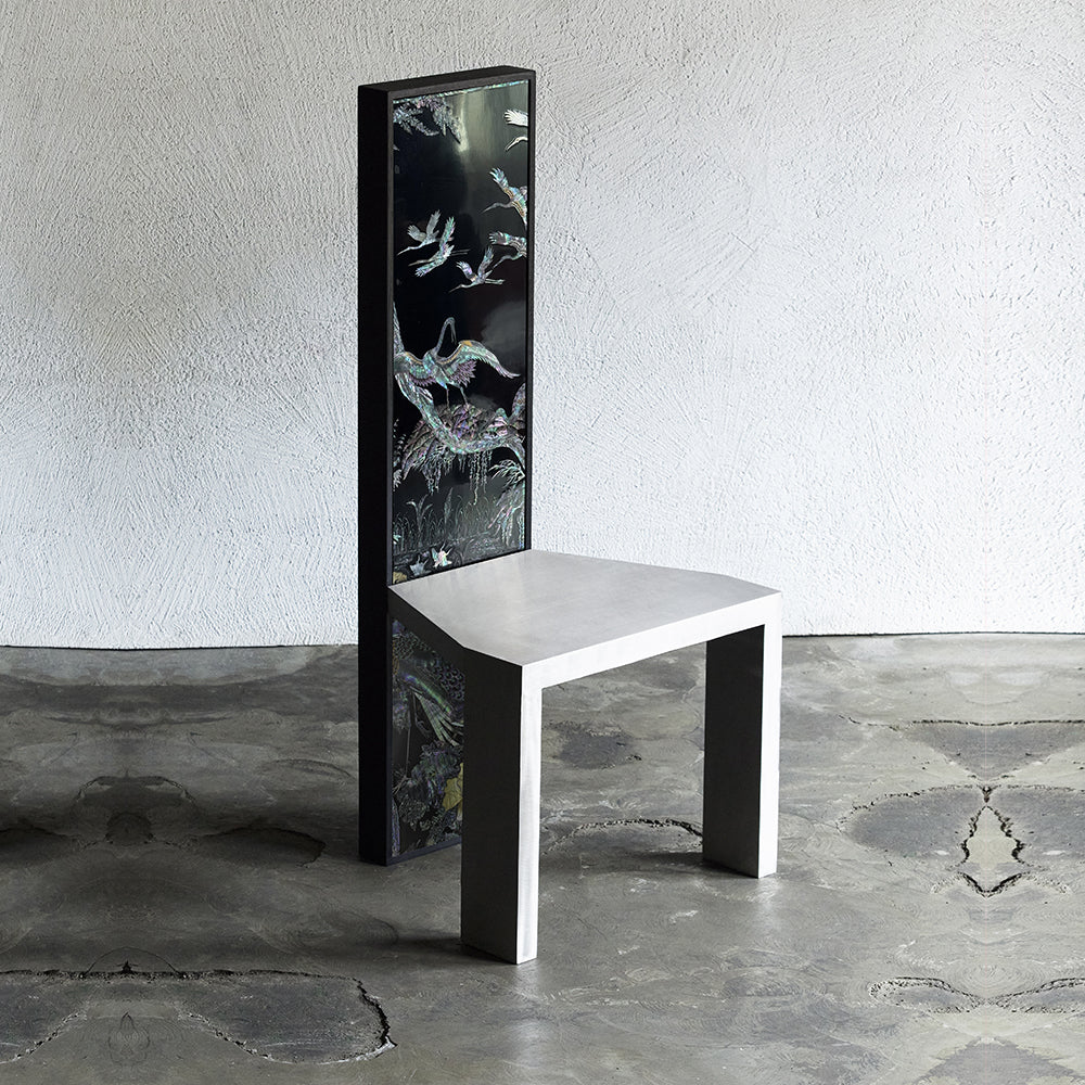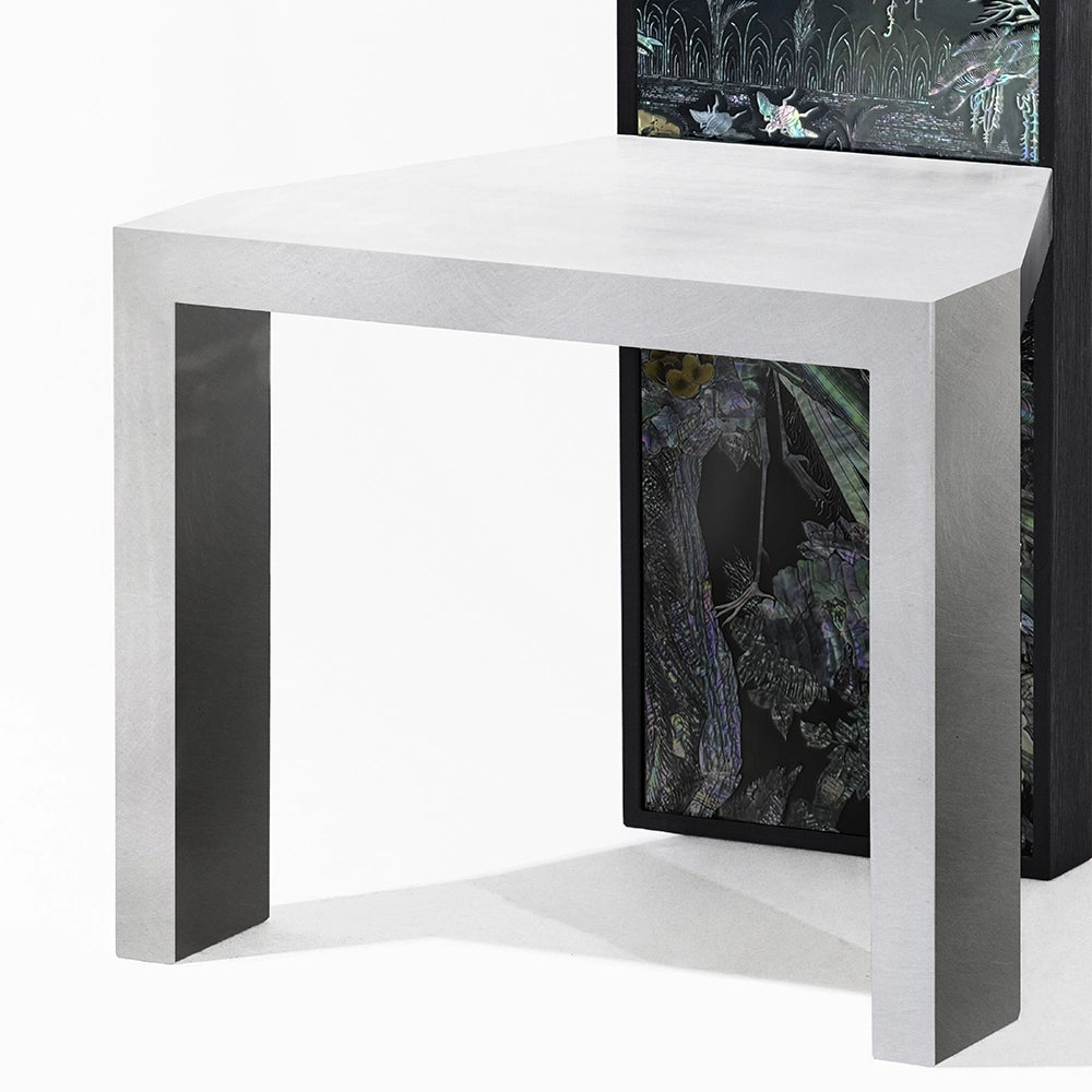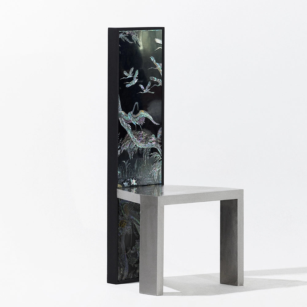 Cette chaise associe une structure en acier inoxydable à des panneaux de laque coréenne vintage. Le dossier vertical présente une surface narrative, tandis que l'assise reste sobre et architecturale, jouant sur le contraste entre image, matériau et fonction.