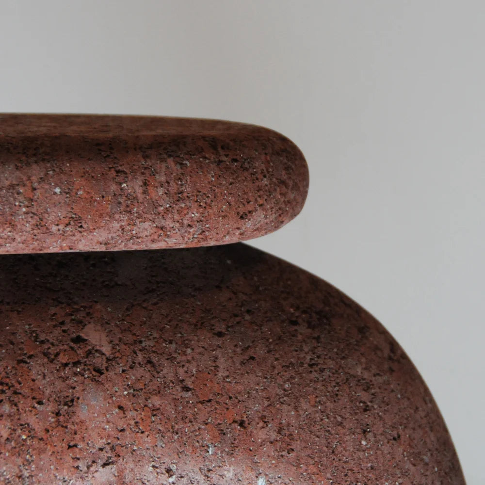 Cette pièce en pierre volcanique se présente comme un volume archaïque sculpté autour d'une ouverture centrale. Son corps massif et poreux évoque un artefact primitif, où la matière brute et le geste sculptural instaurent une présence silencieuse, presque méditative, dans l'espace.