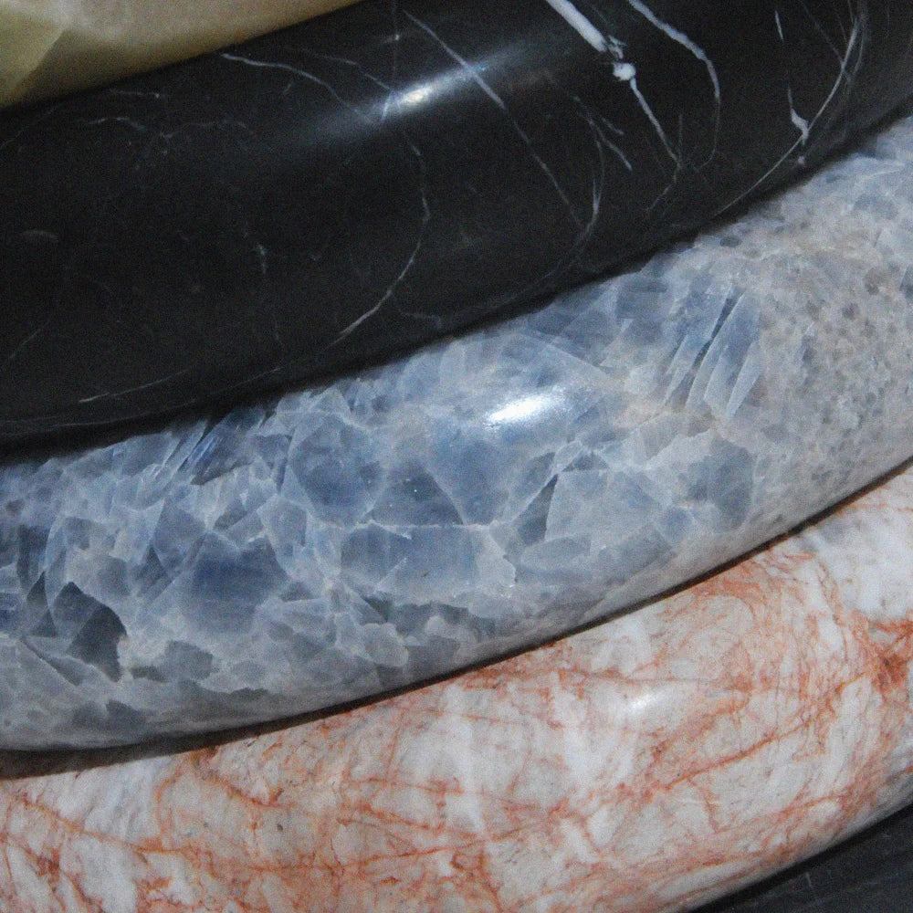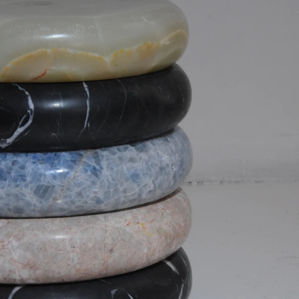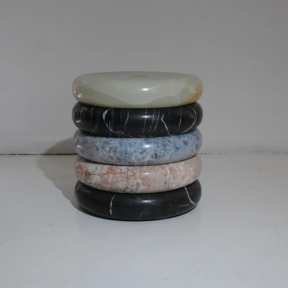 Cette table d'appoint en marbre est composée de volumes superposés aux formes douces et arrondies, soigneusement polis. La superposition de ces volumes crée une silhouette dense et apaisante, tandis que les veines naturelles confèrent à chaque pièce un caractère unique, alliant fonctionnalité et présence sculpturale.