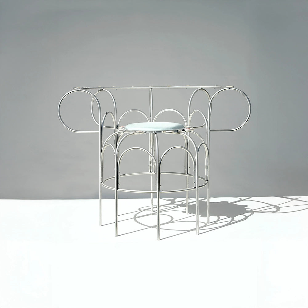 Ce fauteuil en aluminium présente une structure légère, semblable à un fil de fer, ponctuée de coquillages intégrés faisant office d'éléments ornementaux. Sa forme ouverte, presque florale, crée un volume aérien où se rencontrent le métal et des fragments naturels, à mi-chemin entre assise fonctionnelle et objet sculptural.