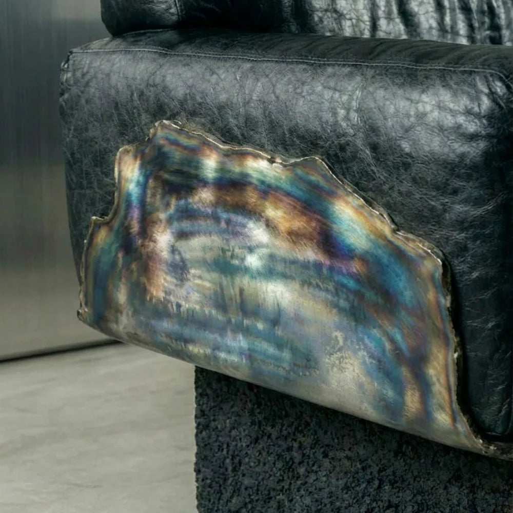 Ustio Armchair explore le feu comme force de transformation. Sa structure en acier brûlé conserve les traces du processus, contrastant avec une assise en cuir et un piètement minéral, où tension, matière et vide coexistent.