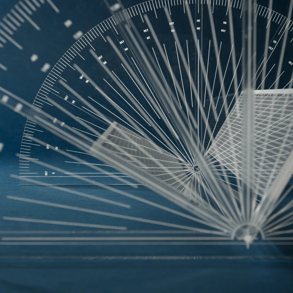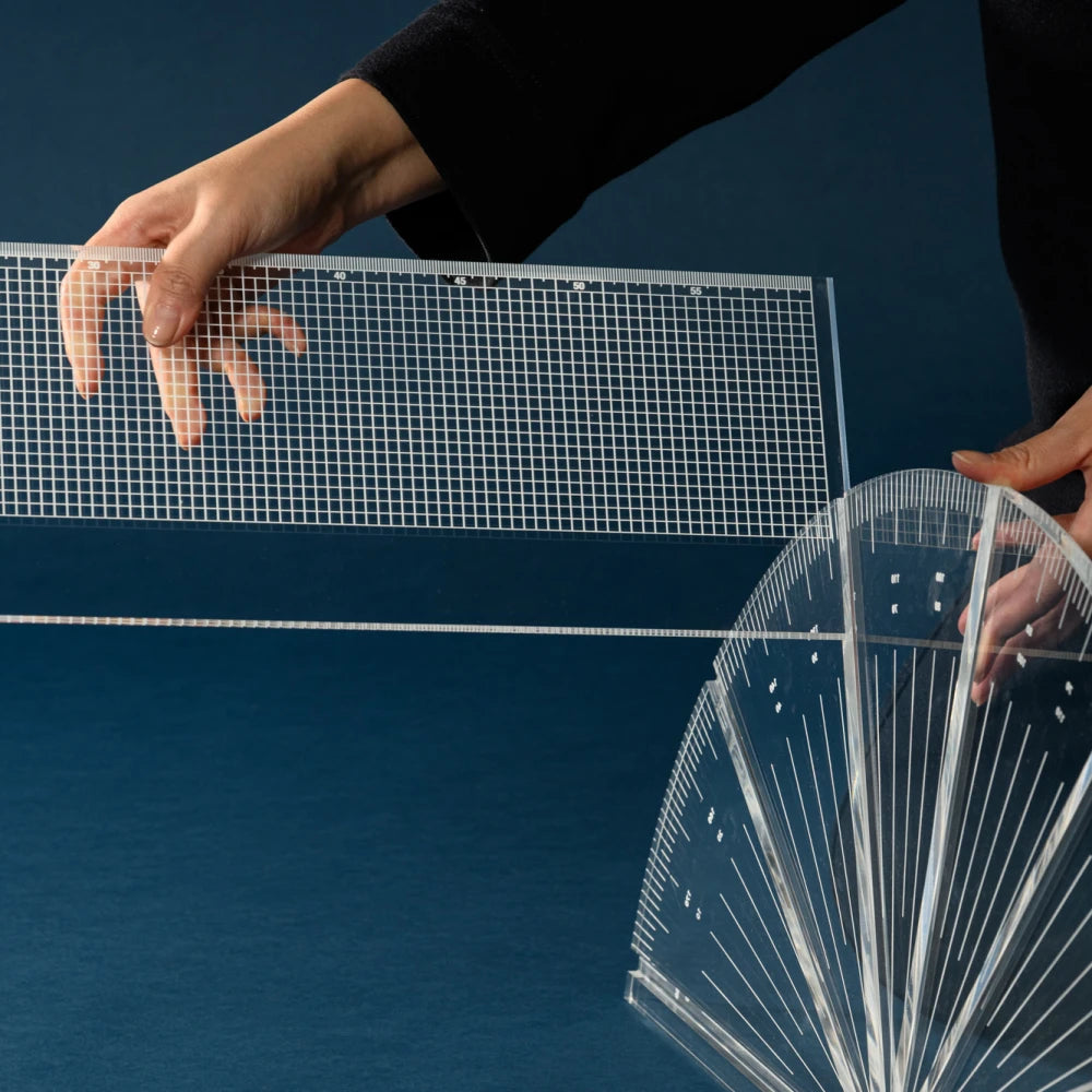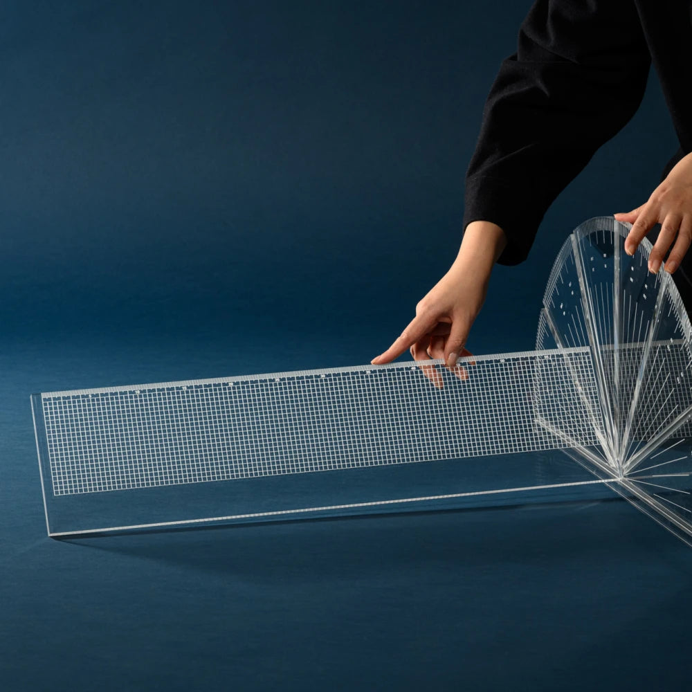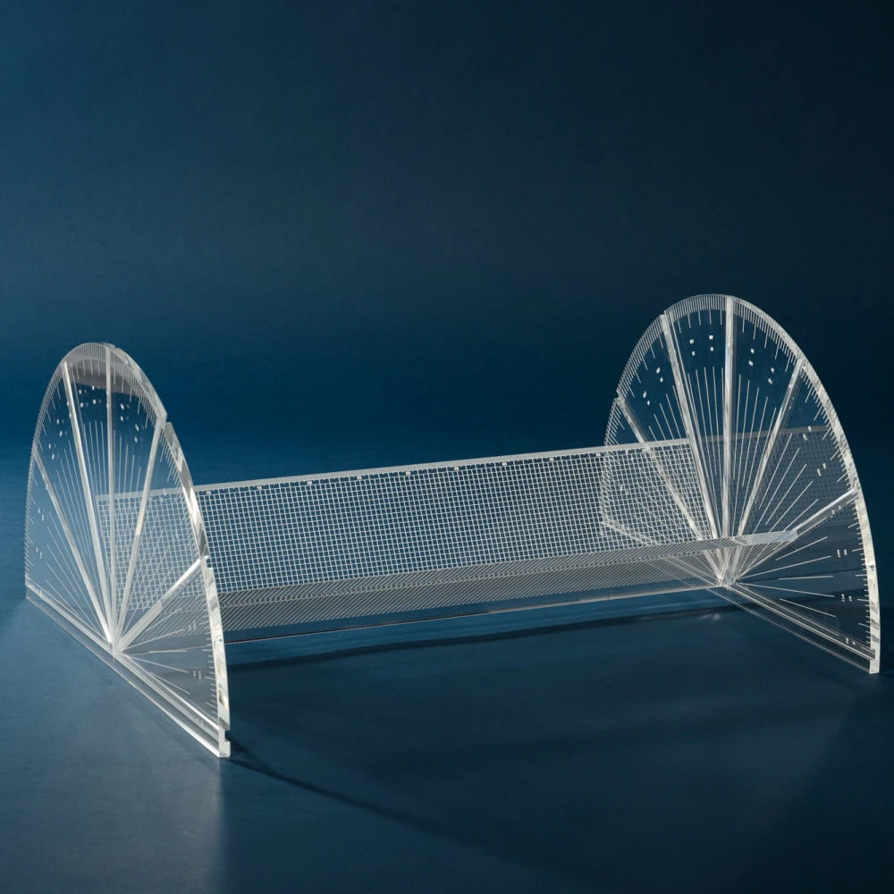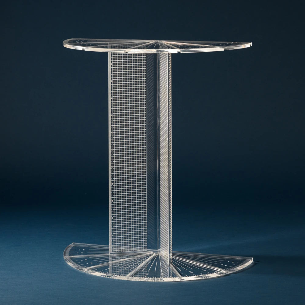 This table translates geometric tools into a modular structure shaped by angle and variation. Transparency lightens the volume, revealing connections and balance, creating a precise presence that appears to float lightly within space.