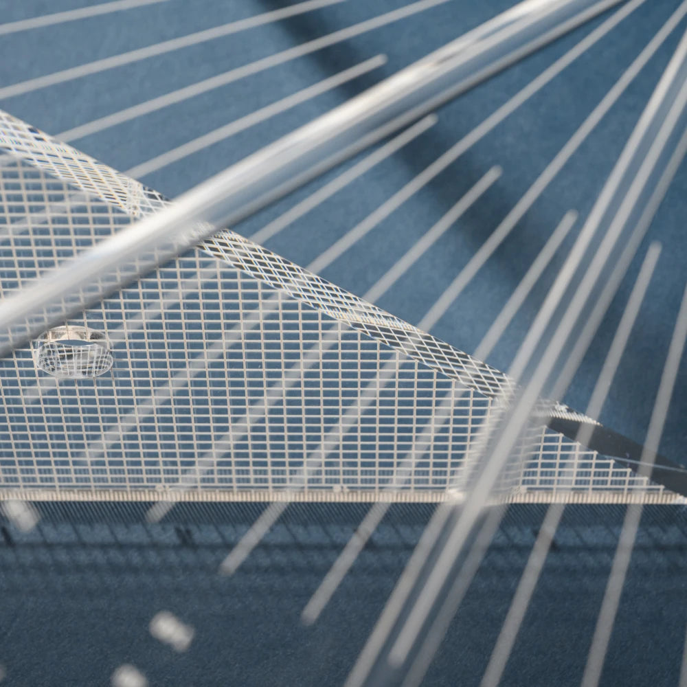 This table assembles inclined planes and perforated surfaces through a clear geometric logic. Angles structure the volume and distribute support, forming a stable, legible object where transparency reveals construction and spatial rhythm.