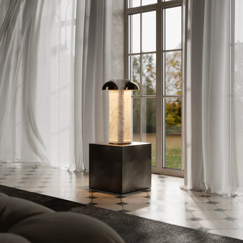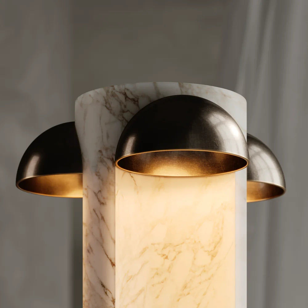 Arcades is a table lamp built around a hollowed mineral volume, topped with metal half-spheres. Light passes through the material, revealing its depth and giving the object a dense yet measured presence.