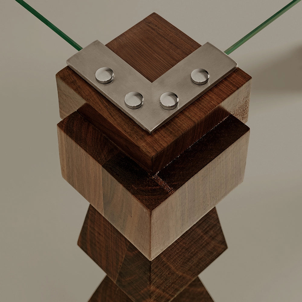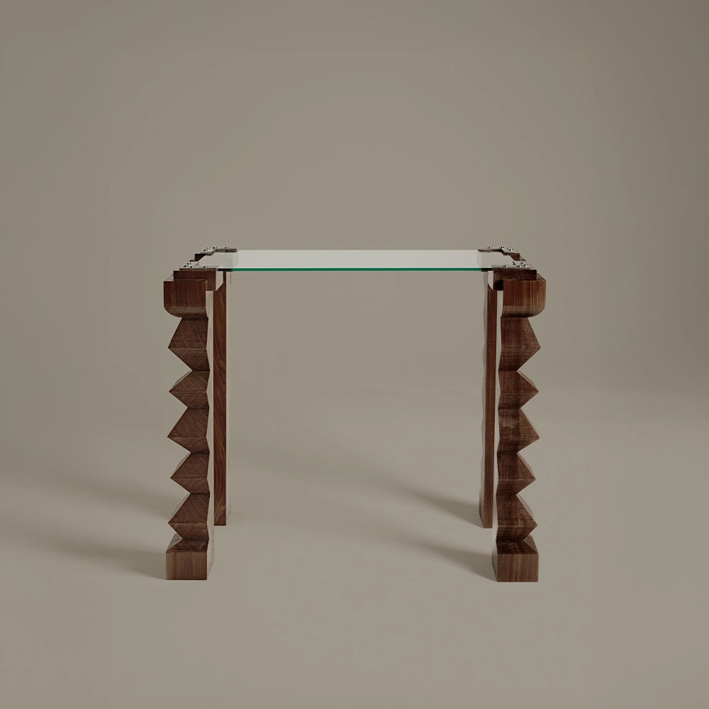 Inspired by Fortunato Depero’s Balli Plastici, Attimo Console Table translates rhythmic movement into form. Hand-carved legs balance mechanical precision with expressiveness, grounded by warm walnut and contrasted by the clarity of glass.