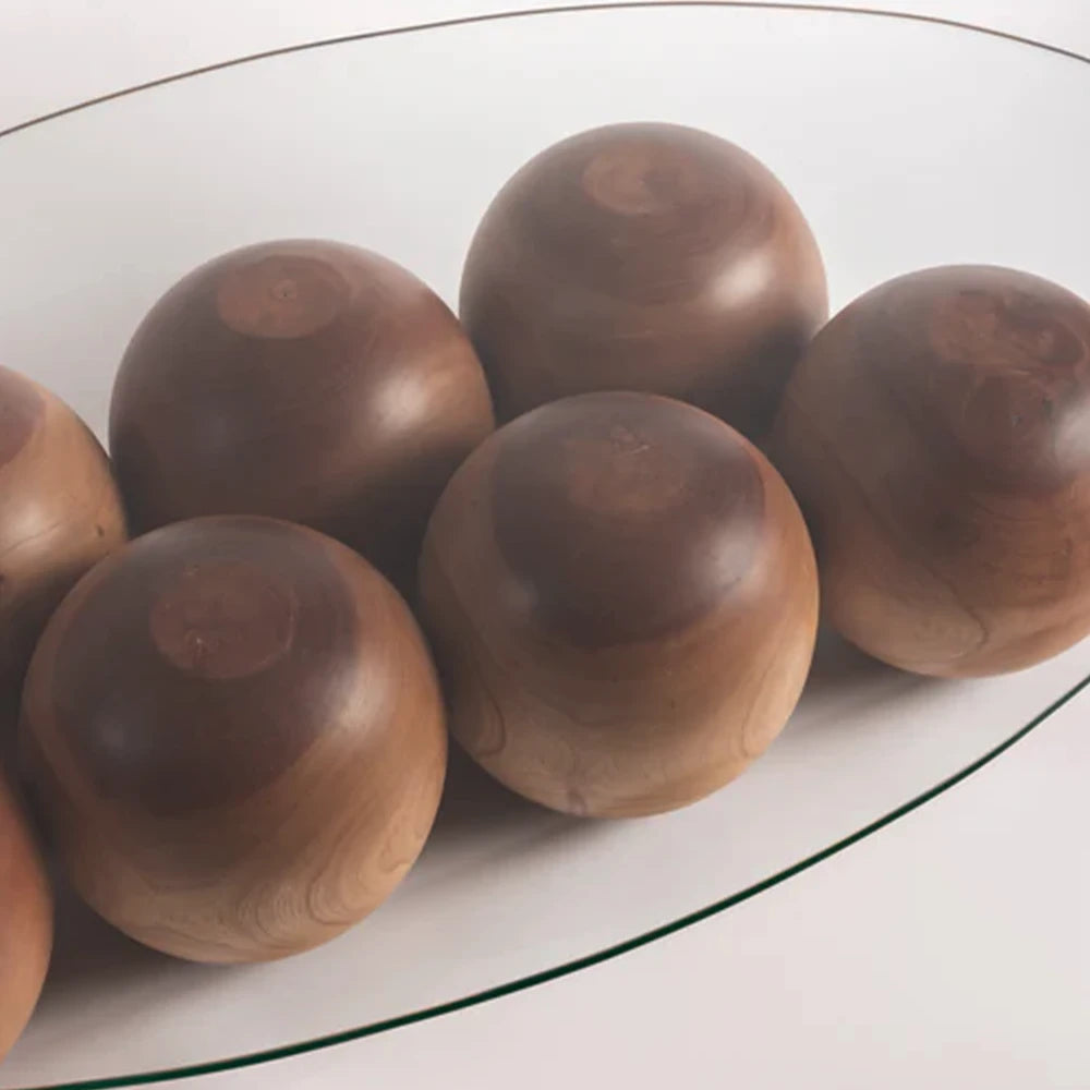 The Bala Coffee Table pairs an elliptical glass top with a base formed by solid wooden spheres. Rounded volumes and transparency create a low, graphic presence where material contrast and balance define the composition.