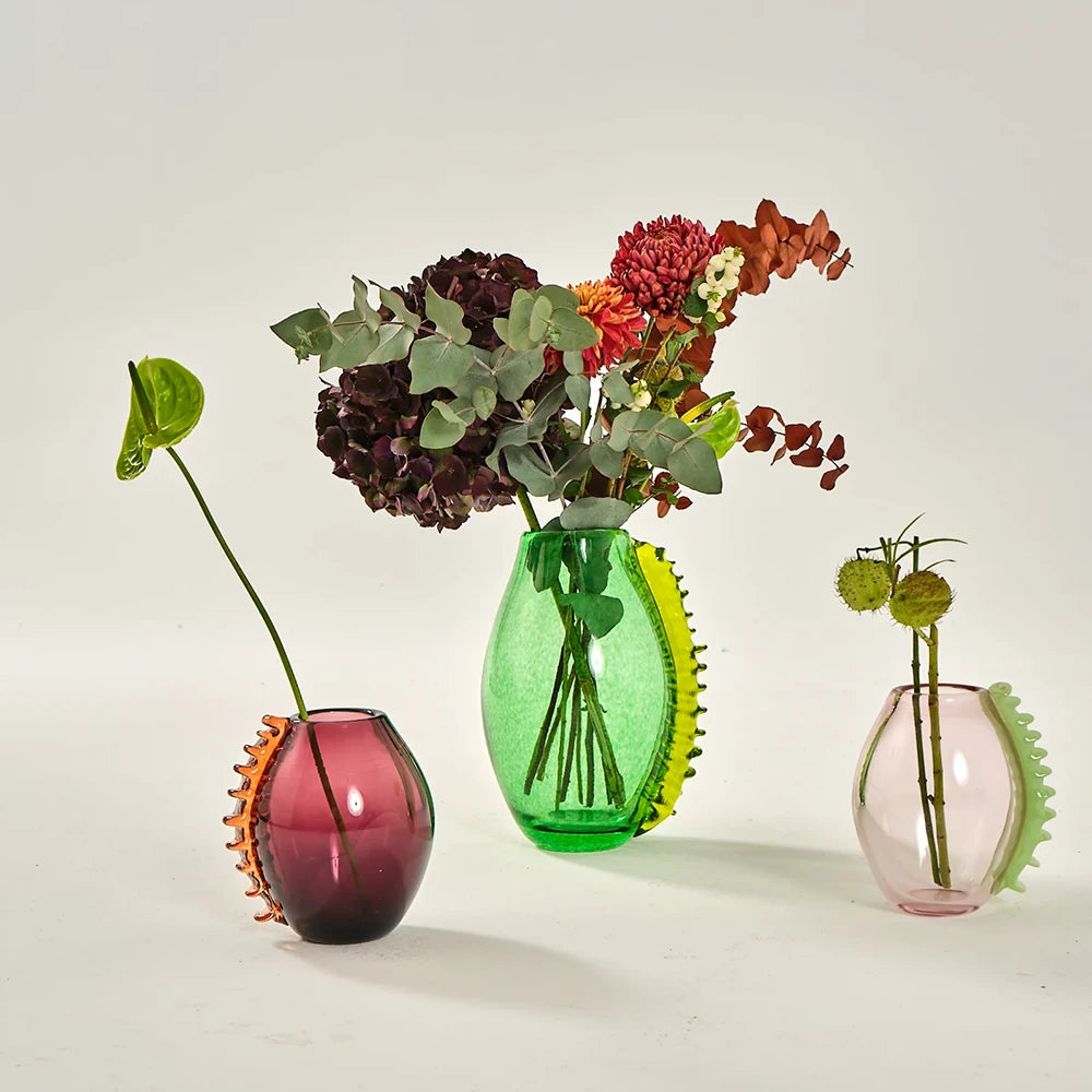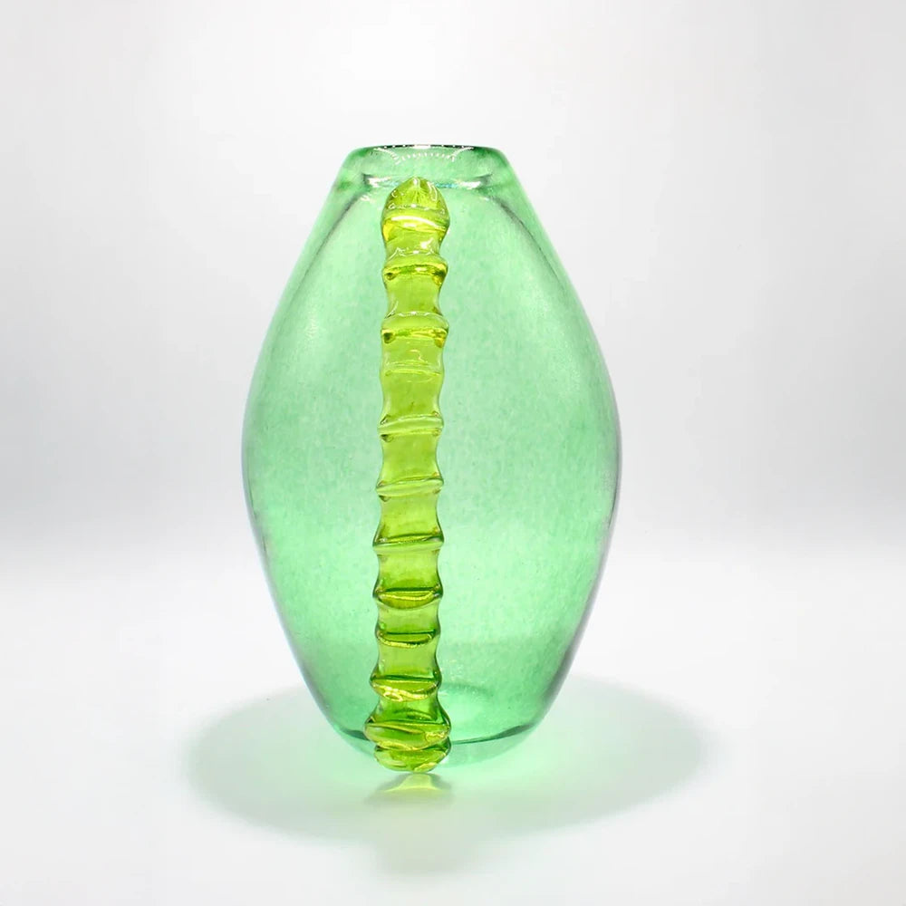 Blown glass vase with an organic silhouette, defined by a textured contrasting ridge. Its translucent color captures the light and reveals the material, transforming a decorative gesture into an expressive and distinctive presence.