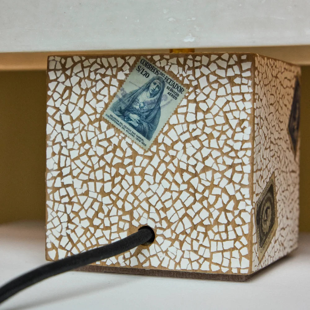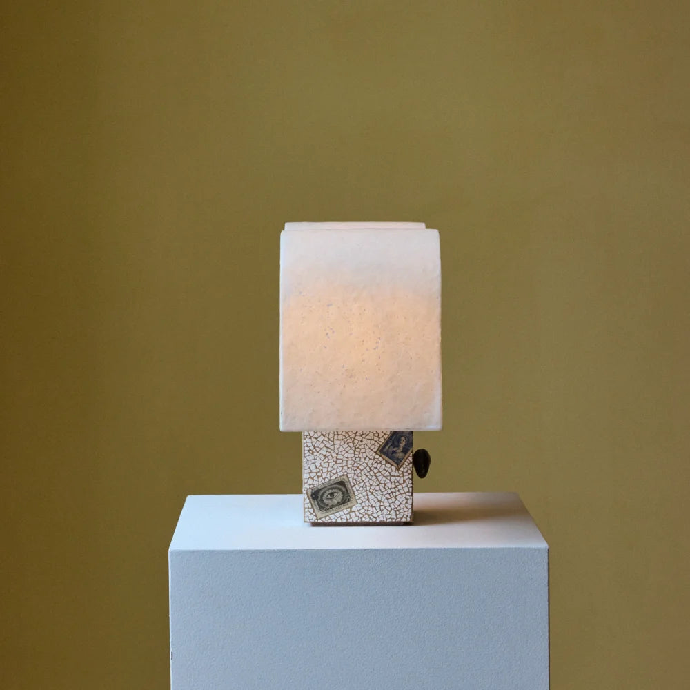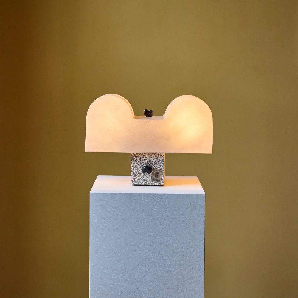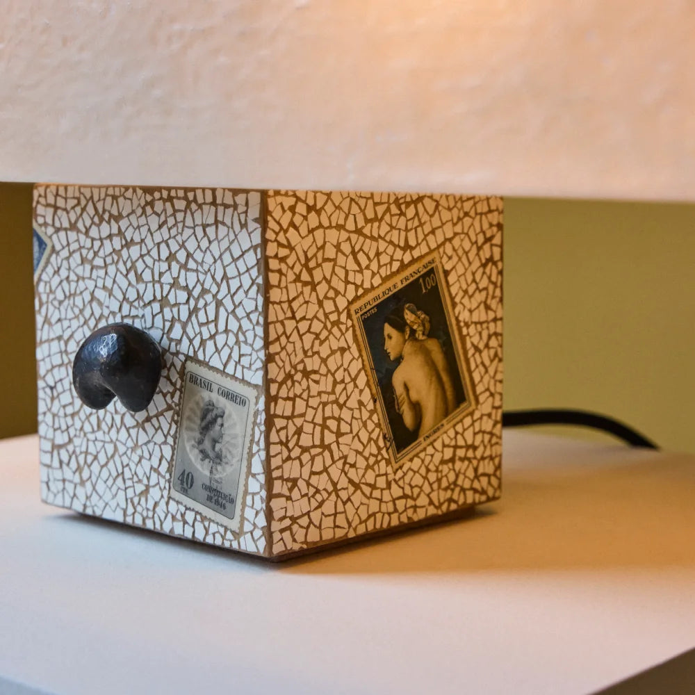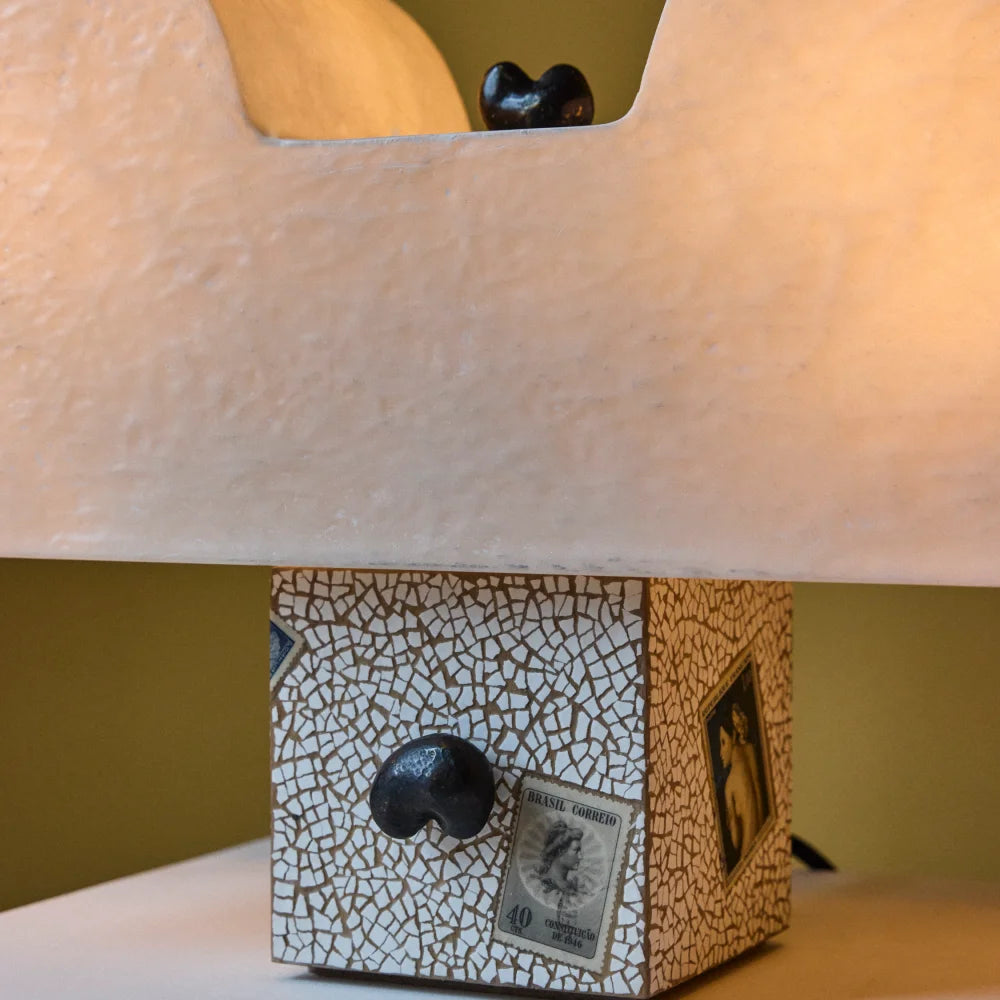 A sculptural table lamp crafted from solid Freijó wood and fibreglass, enriched with brass, eggshell and stamped details. A poetic, frontal composition where material and symbolism meet in a delicate balance of art and light.