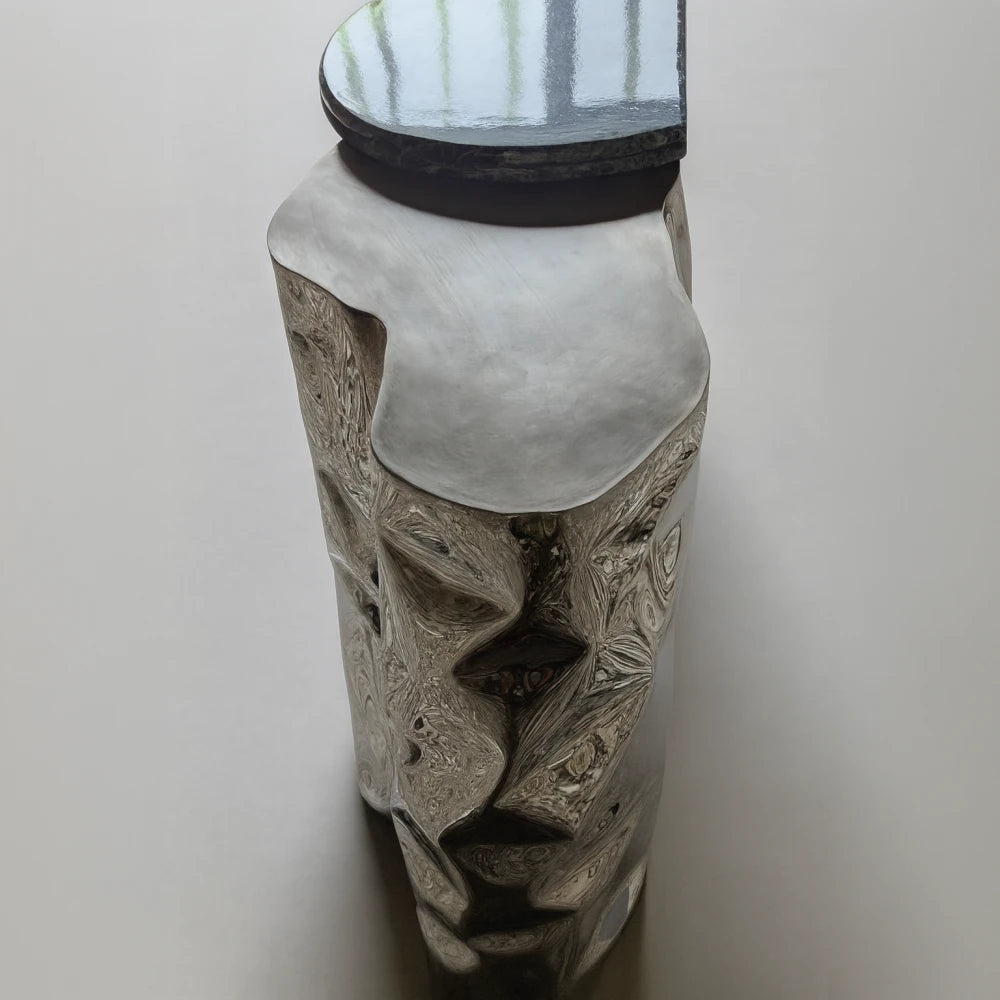 Sculptural console with assertive proportions, pairing a sharply contoured mineral top with volumes of polished stainless steel shaped as compressed matter. Metallic folds capture light and structure the space with controlled intensity and architectural clarity.