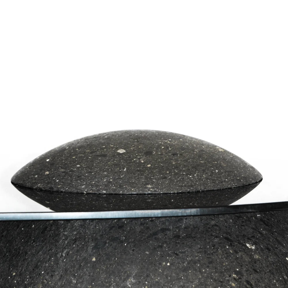 This side table combines a sculptural base in dark cantera stone with a smoked glass top. The balance between mineral mass and suspended surface creates a presence that feels both grounded and quiet, where materiality enters into dialogue with the lightness of the gesture.