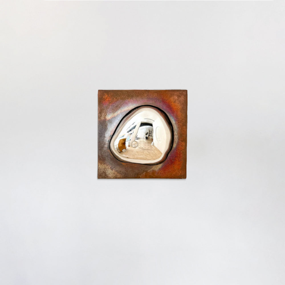 A collection of wall mirrors combining blown glass and hammered copper. Fluid glass forms emerge from metal surfaces, creating reflective compositions that explore transformation, material contrast, and the tension between warmth, light, and space.