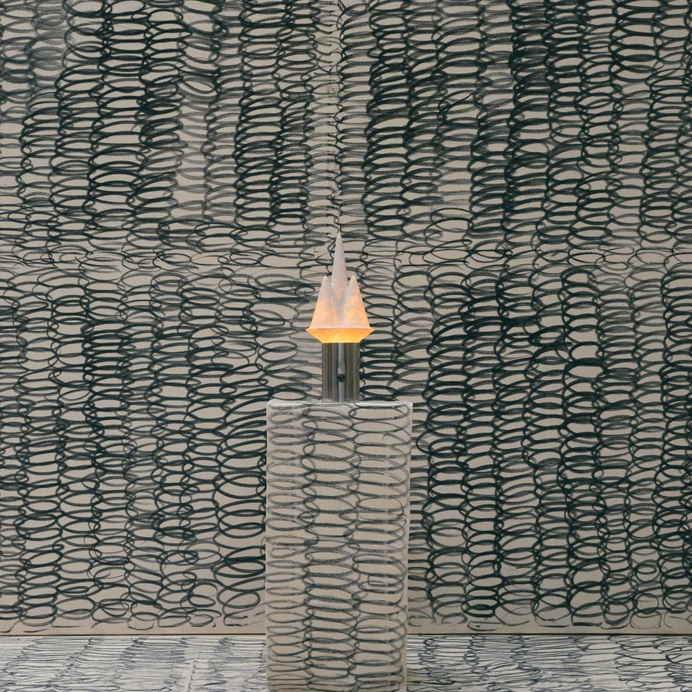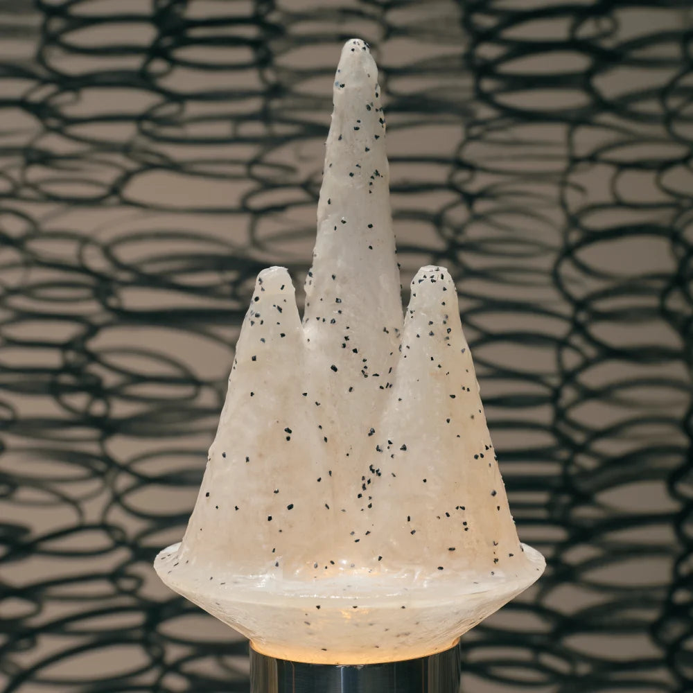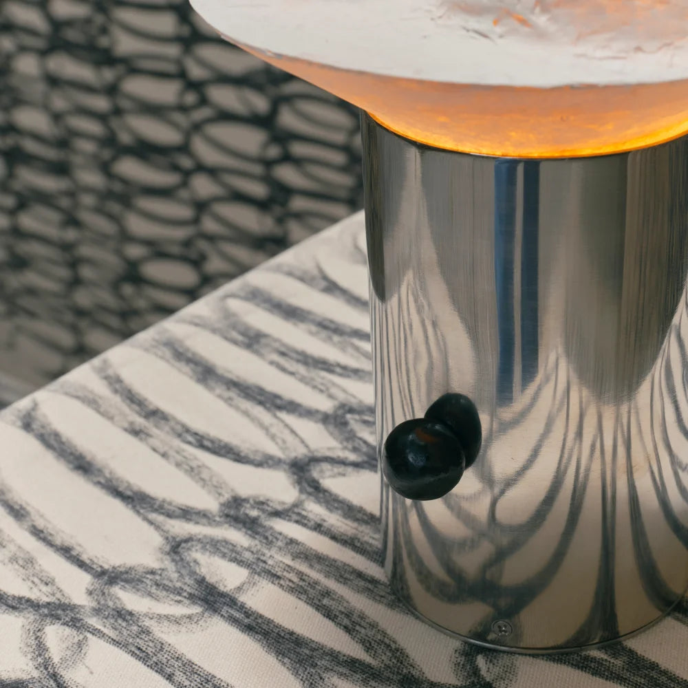 A sculptural table lamp combining stainless steel and painted resin. Light diffuses through an expressive, mineral form, contrasting with the polished metal base to create a striking, visually engaging presence.