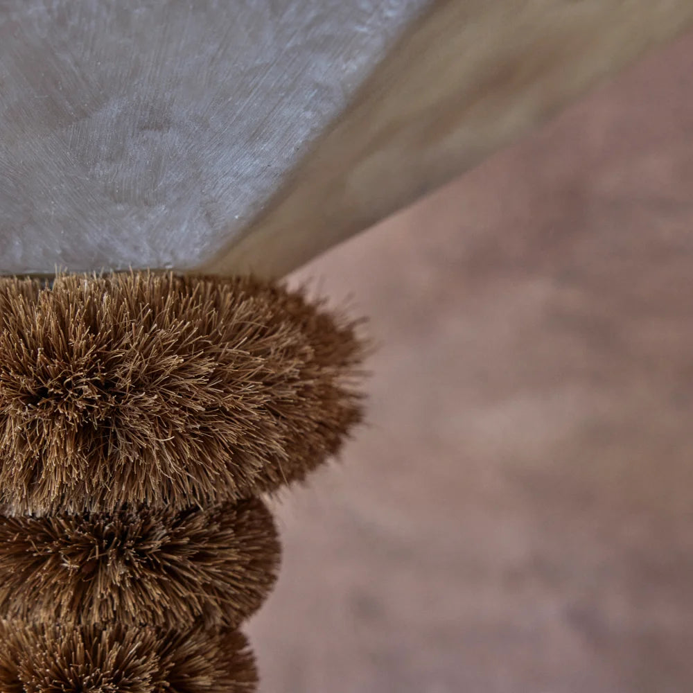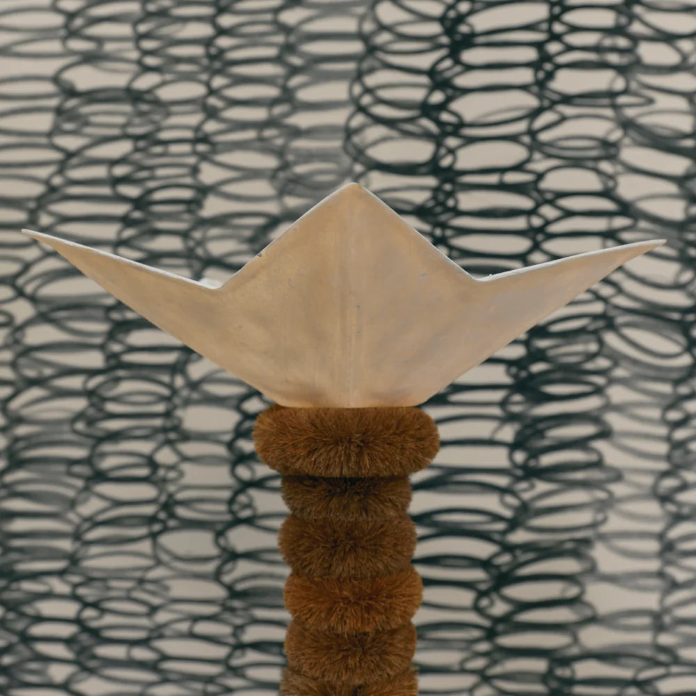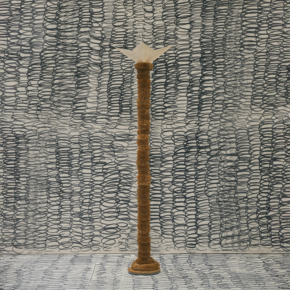 A sculptural floor lamp combining steel, coconut fiber and fibreglass. Its richly textured, organic column contrasts with a softly diffused light at the top, creating a totemic piece balancing raw materiality and poetic presence.