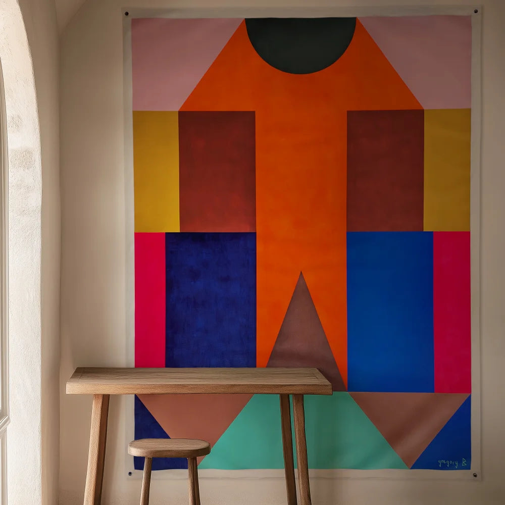 Symmetrical composition built around a central vertical form, combining rectangular and triangular color fields in orange, blue, pink, ochre, red, and seafoam tones. Acrylic on textile, each work carries its singularity and unfolds a strong visual presence within a space.