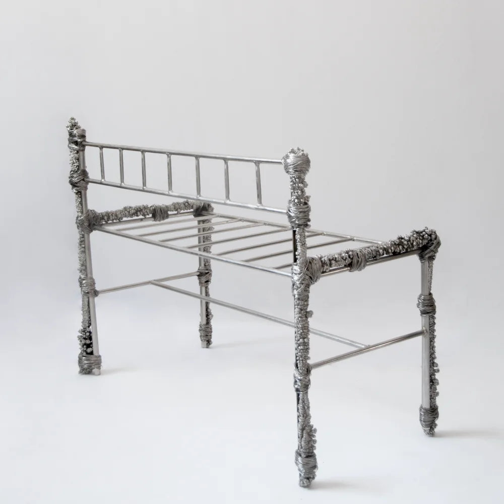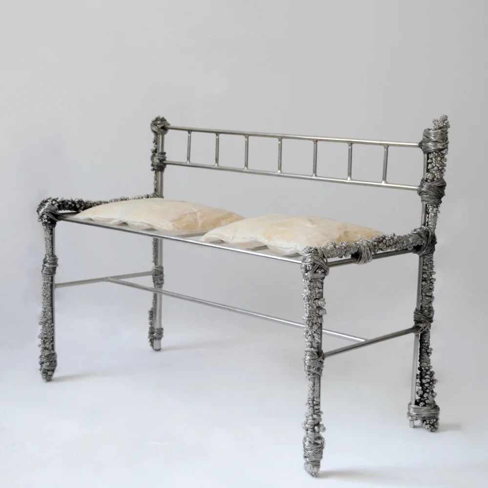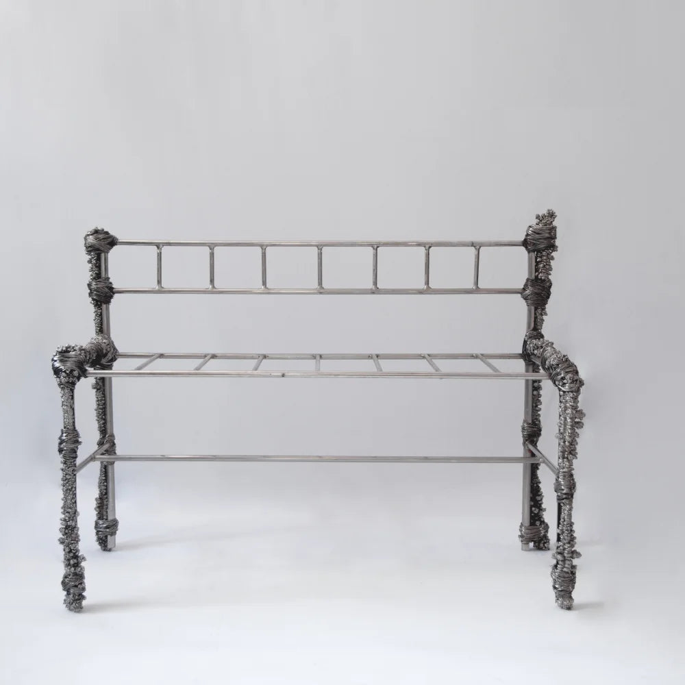 This bench in recycled metal combines a rigorous frame with irregular deposits that feel time-worn and accreted. Textured conglomerations contrast with the functional line of the seat, turning a utilitarian piece into a raw, narrative object.