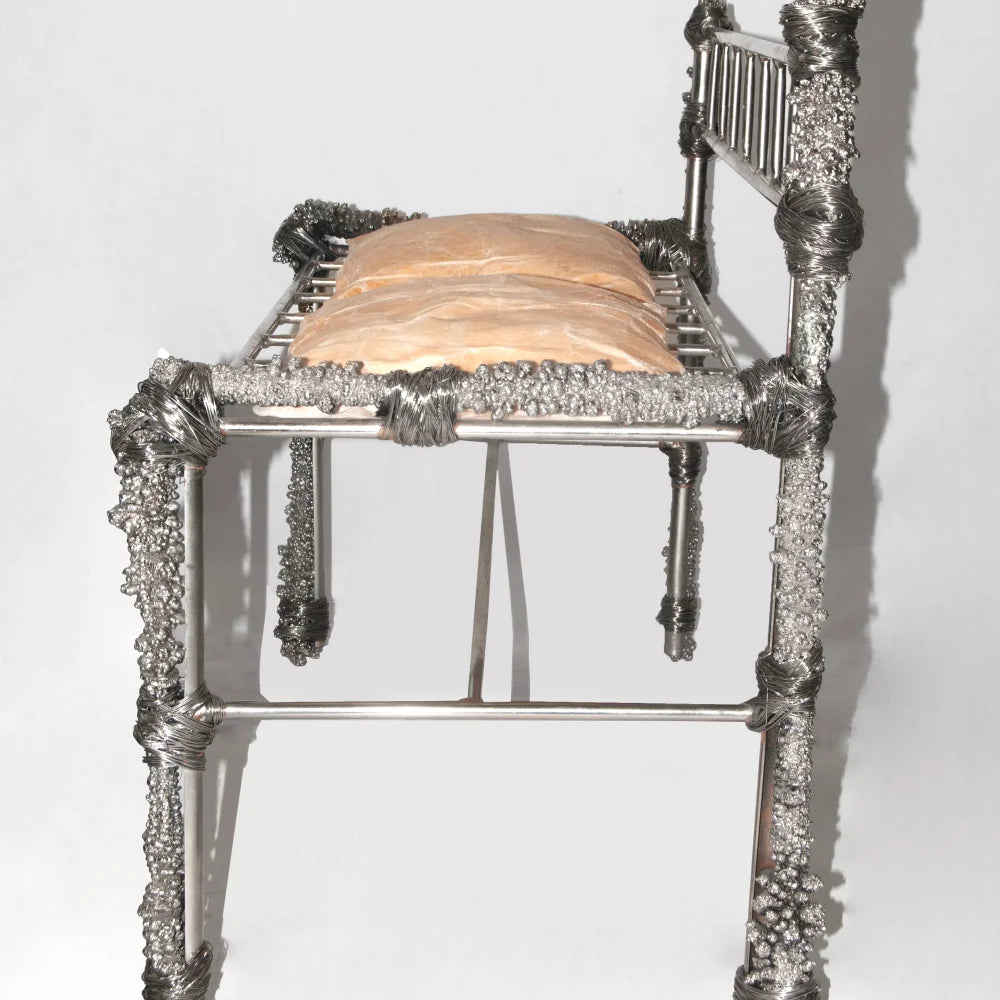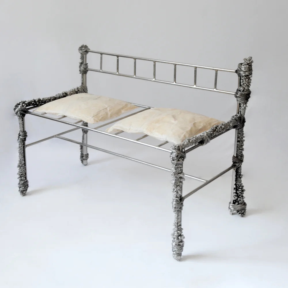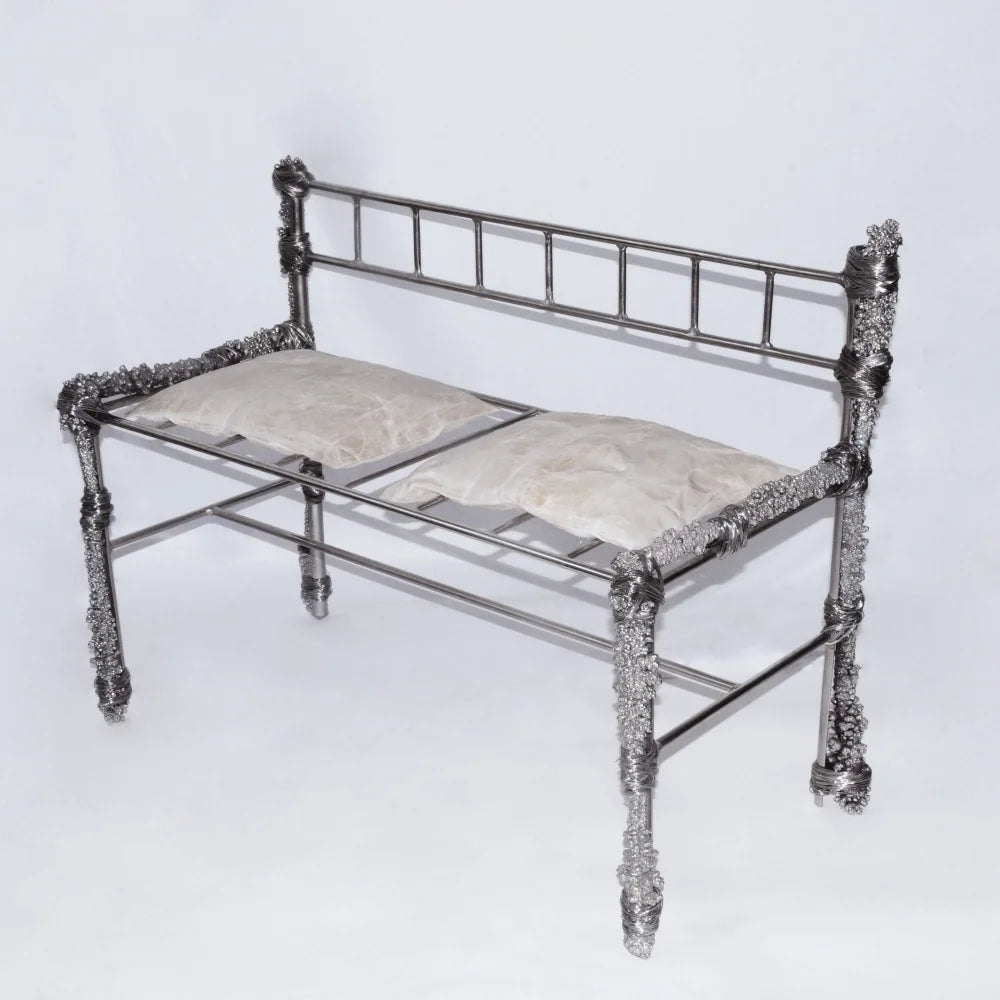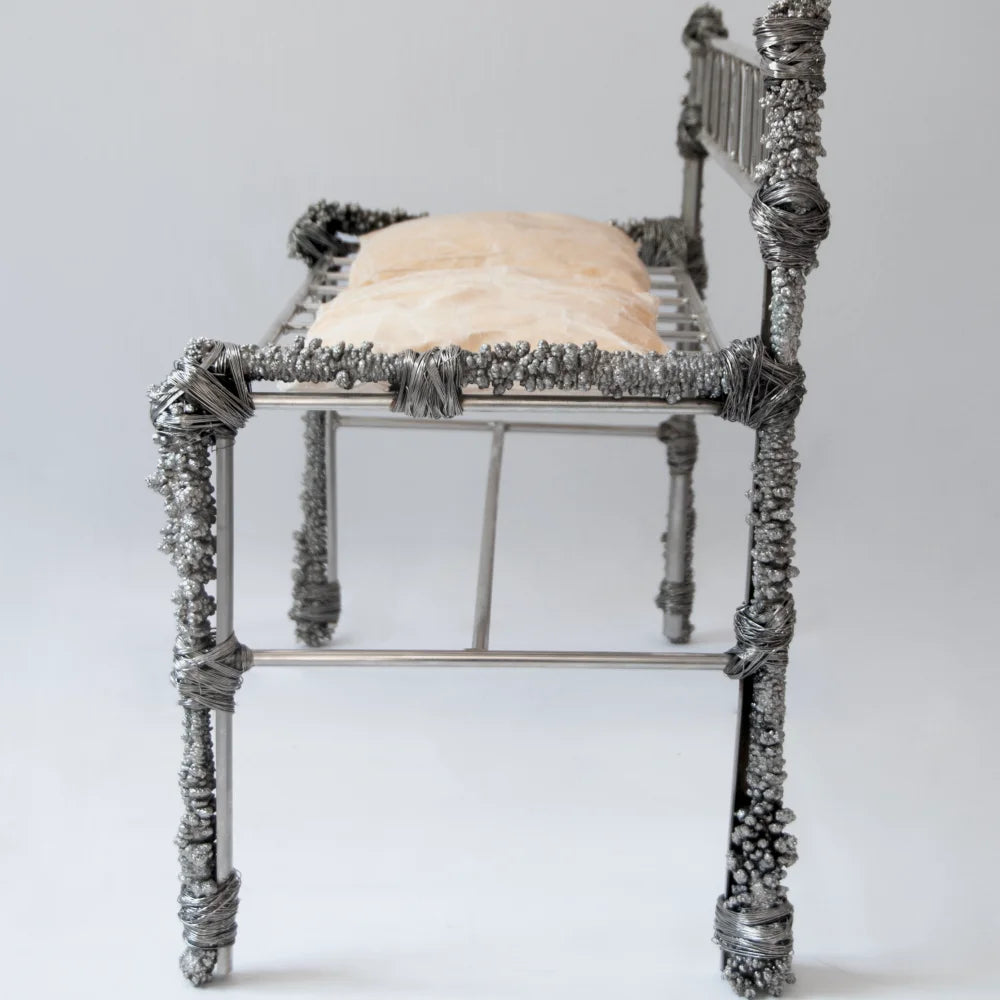 This bench in recycled metal combines a rigorous frame with irregular deposits that feel time-worn and accreted. Textured conglomerations contrast with the functional line of the seat, turning a utilitarian piece into a raw, narrative object.
