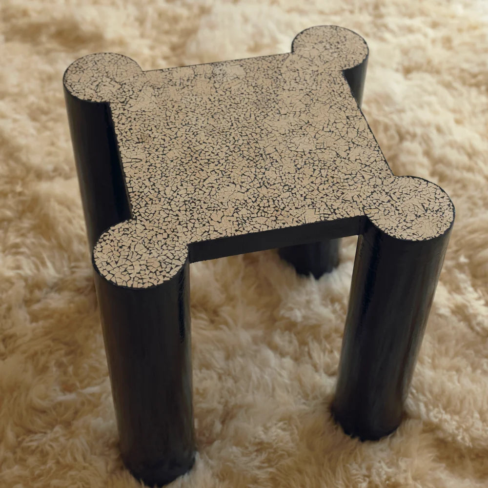 A sculptural side table crafted from steel, finished with egg-shell lacquer and enamel paint. Cylindrical legs and a softly contoured top create a precise balance between structural rigor and tactile surface.