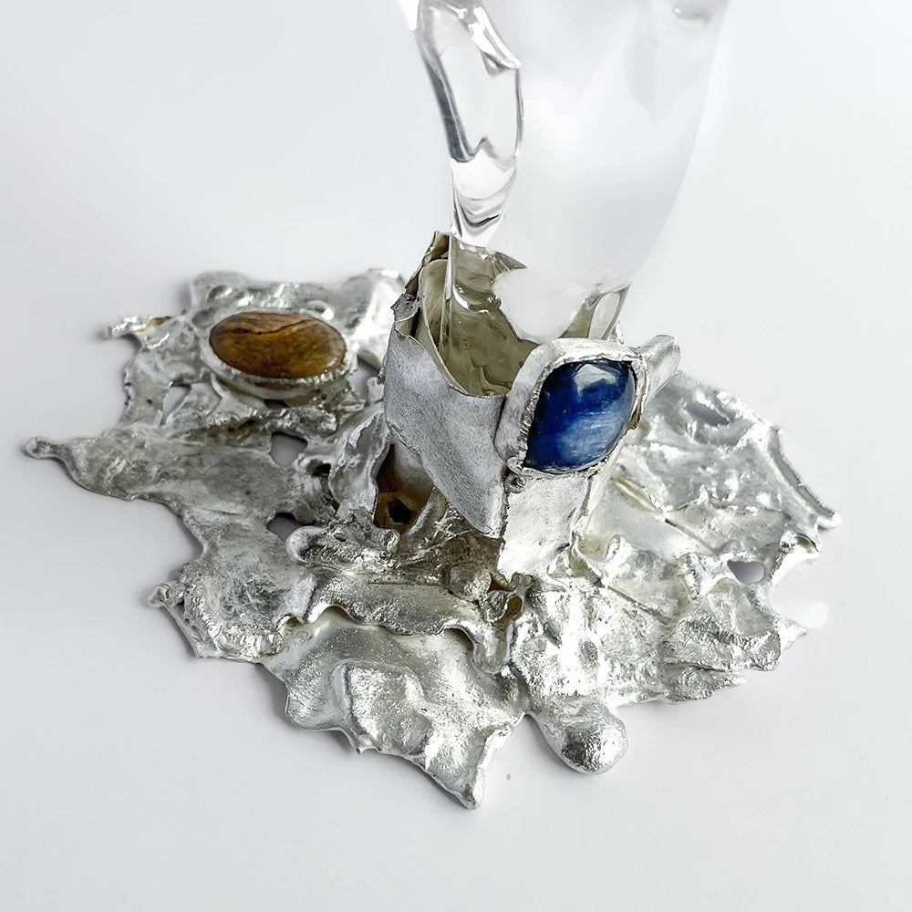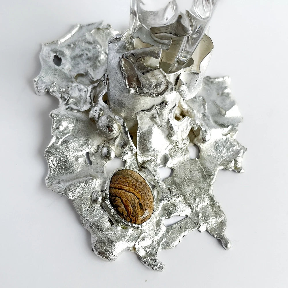 Lead-free crystal goblet anchored by a hand-shaped silver base, set with natural stones. Each piece forms its own unique composition, balancing transparency, texture, and light, for a discreet and precious presence.