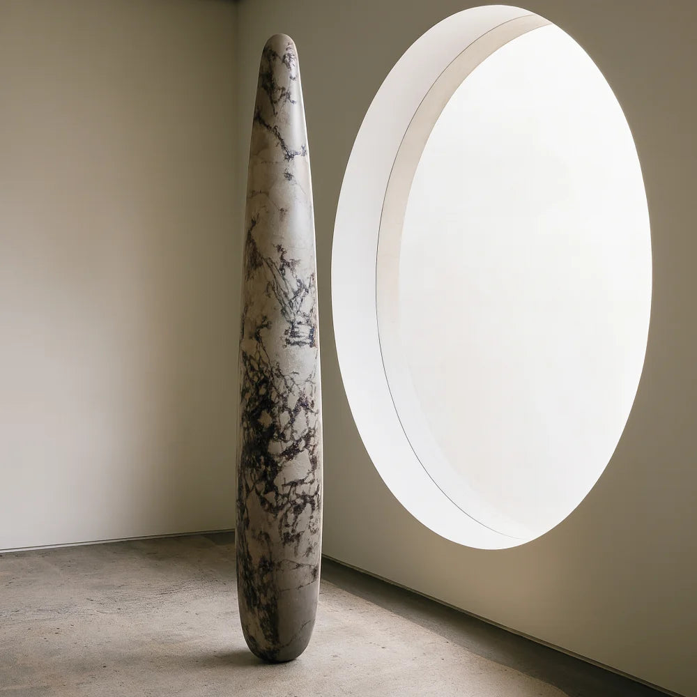 Hero Viola monolith stands as a contemporary totem carved from Calacatta Viola marble. Its vertical, silent presence anchors belief in matter, offering a sense of permanence, poetry, and stillness shaped by time, ritual, and enduring human imagination.